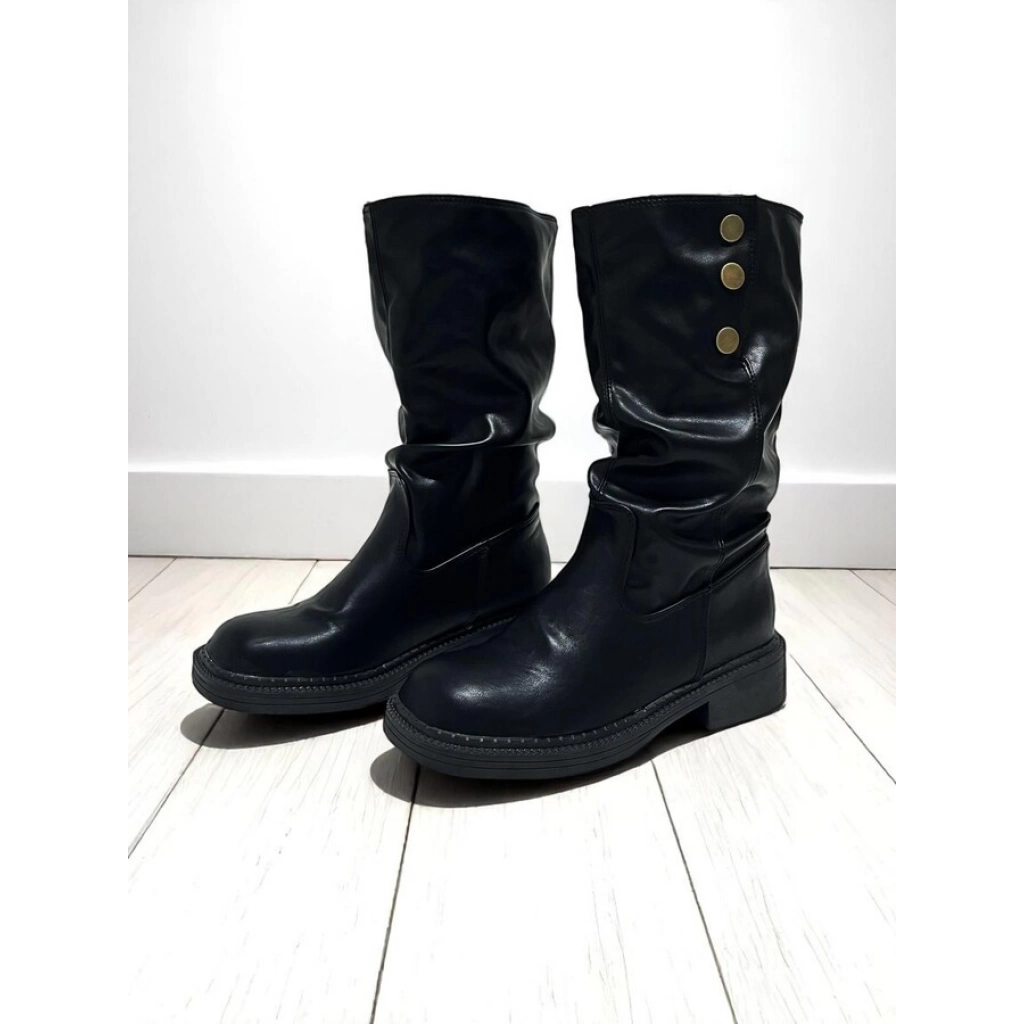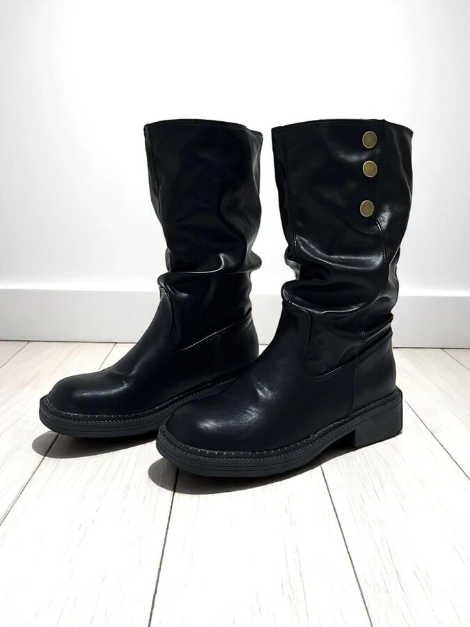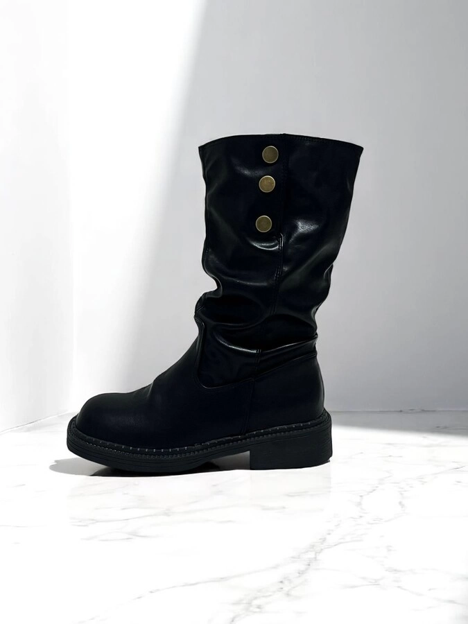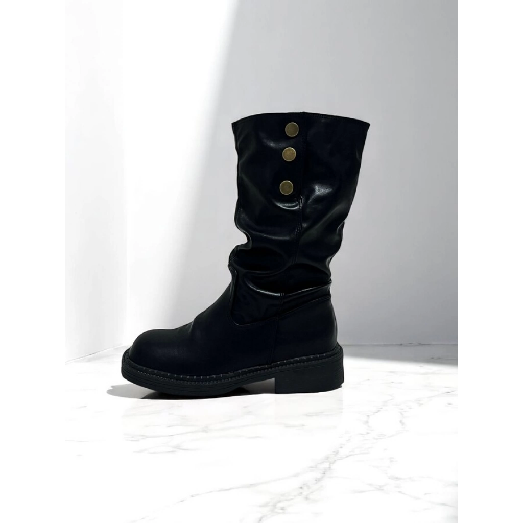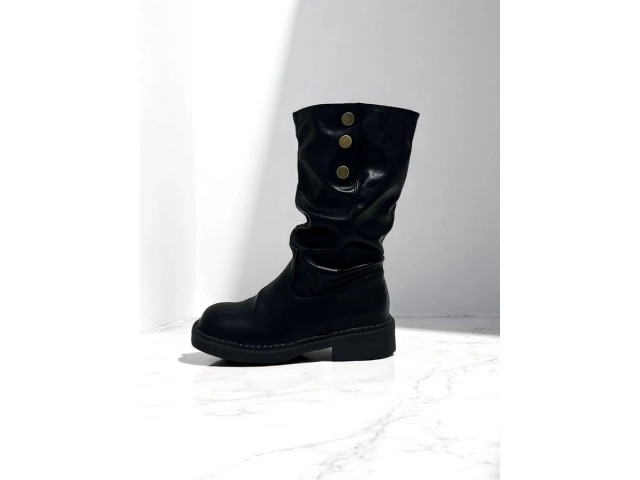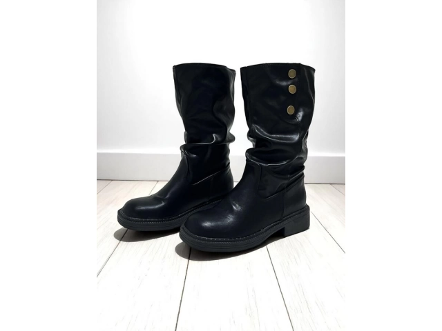 Botas de gamuza sintética con diseño texano y flecos laterales. De caña media, punta semi-fina y taco bajo.