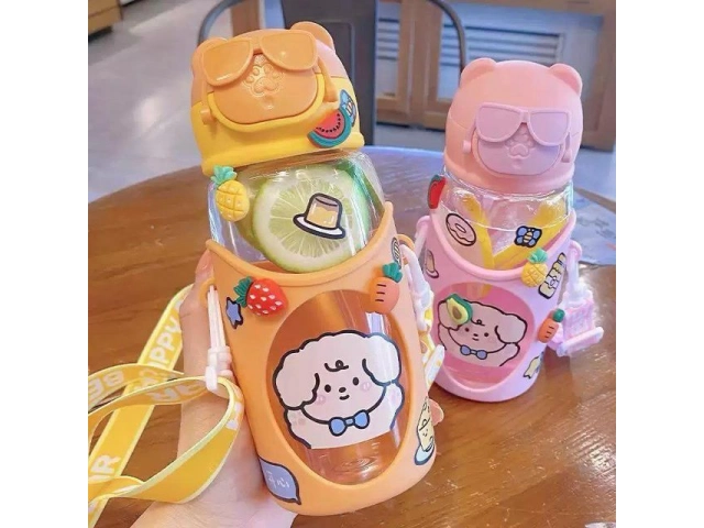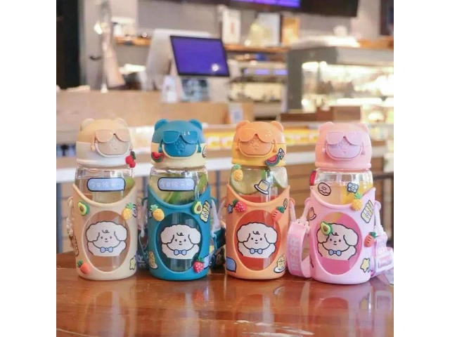 Botella infantil con diseño de osito en la tapa y un perrito en el frente. Decorada con mini frutas y stickers.