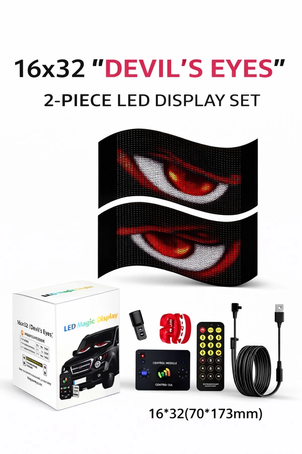 Set de dos pantallas LED flexibles 16×32 con diseño ?Devil?s Eyes?, ideales para instalación en vehículos o decoración. Ofrecen iluminación brillante, colores intensos y múltiples modos programables mediante control remoto o aplicación. Su formato flexible permite adaptarse a distintas superficies curvas. Incluye cables de conexión y controlador. LA CAJA CONTIENE 24 UNIDADES