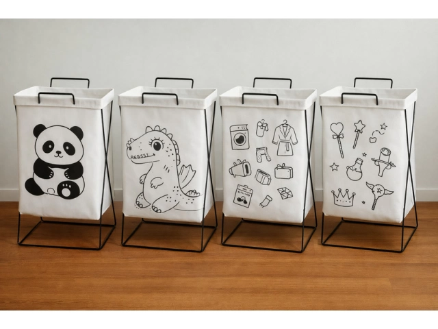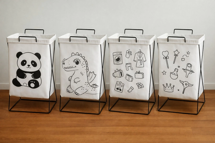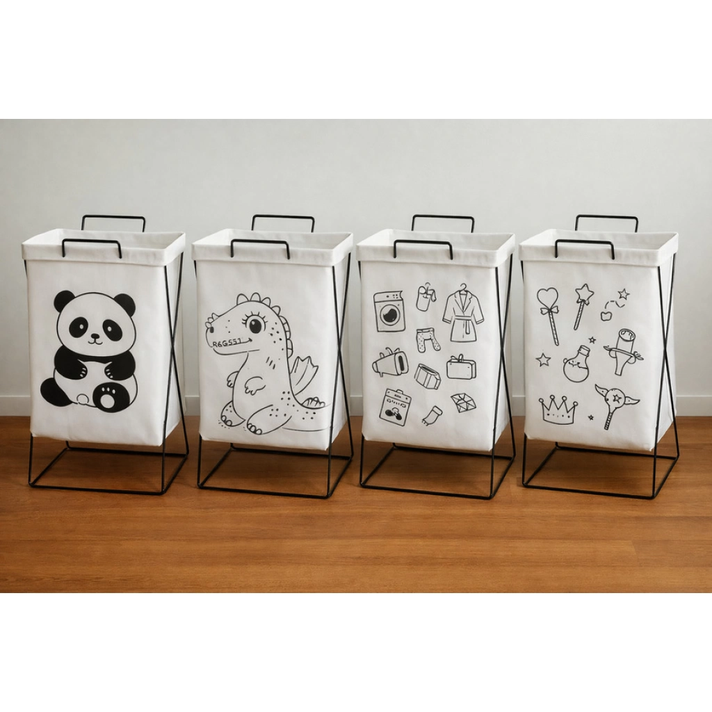 Cesto organizador de tela con variedad de diseños, ideal para ropa, juguetes u objetos del hogar. Estructura firme con soporte metálico, liviano y fácil de mover. Funcional y decorativo, perfecto para dormitorios o cuartos infantiles.