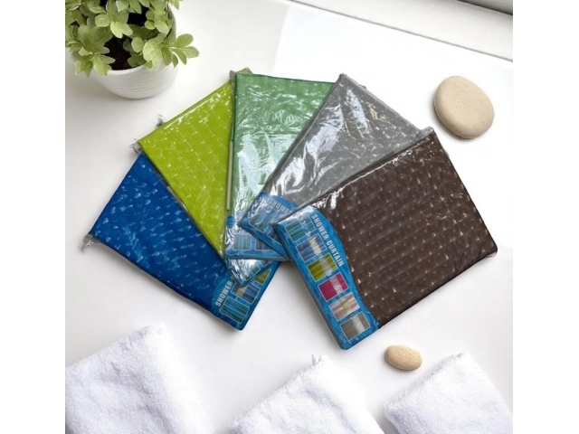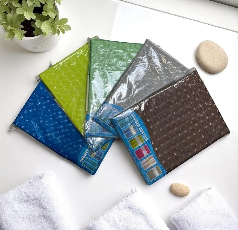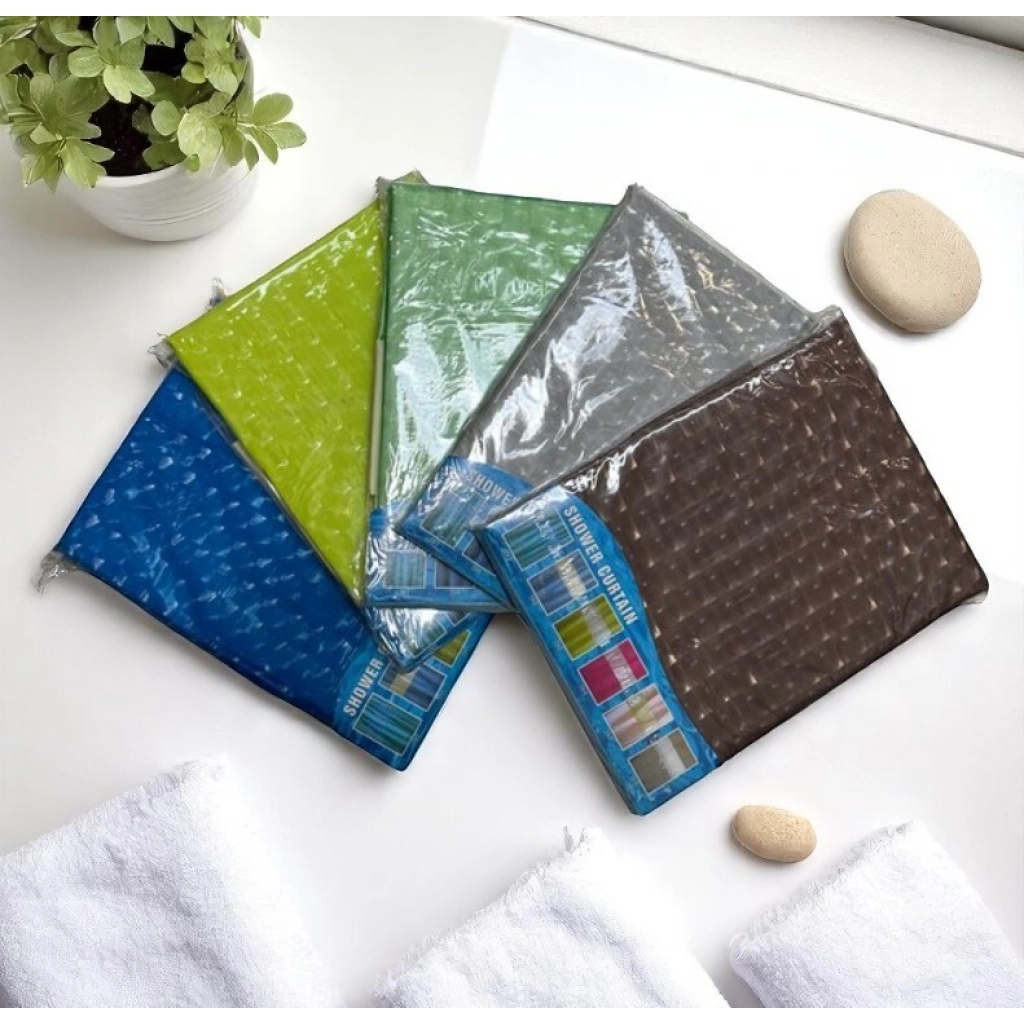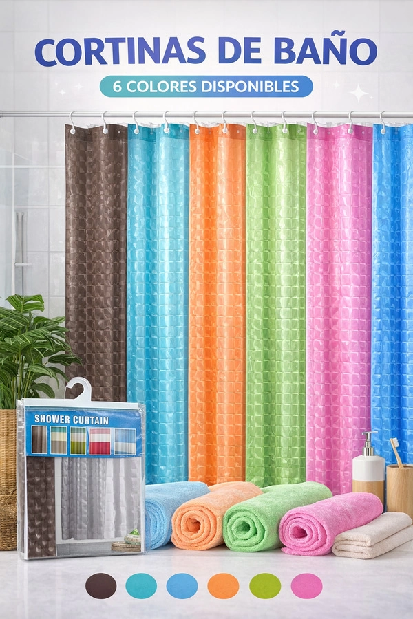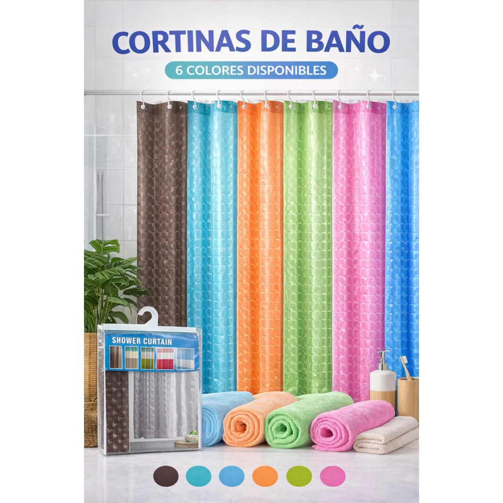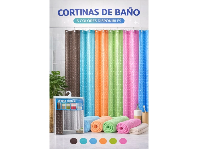 Cortina plástica para baño con diseño variado. Resistente al agua, fácil de limpiar y de colocar. Incluye ojales reforzados. La caja cerrada contiene: 72 unidades