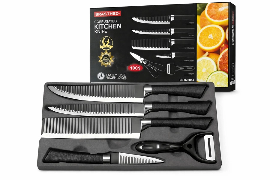Juego de Cuchillos de Cocina con Filo Ondulado ? 6 Piezas Incluye: 1 cuchillo chef grande 1 cuchillo panero ondulado 1 cuchillo multiusos 1 cuchillo para frutas 1 cuchillo pelador 1 pelador tipo Y Características: Filo ondulado para cortes más precisos Mangos ergonómicos antideslizantes Apto para uso diario en cocina Presentación en estuche organizador LA CAJA CERRADA CONTIENE: 30 SETS