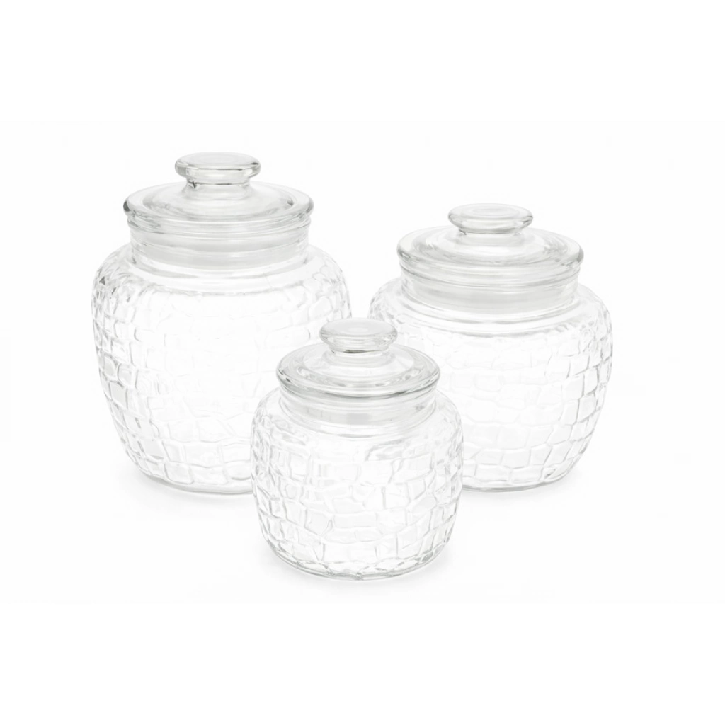 Juego de frascos de vidrio transparente con tapa, diseño elegante y resistente. Ideales para almacenar alimentos, dulces, cereales o decorar tu cocina. Material duradero, fácil de limpiar y con cierre seguro que ayuda a conservar el contenido por más tiempo.