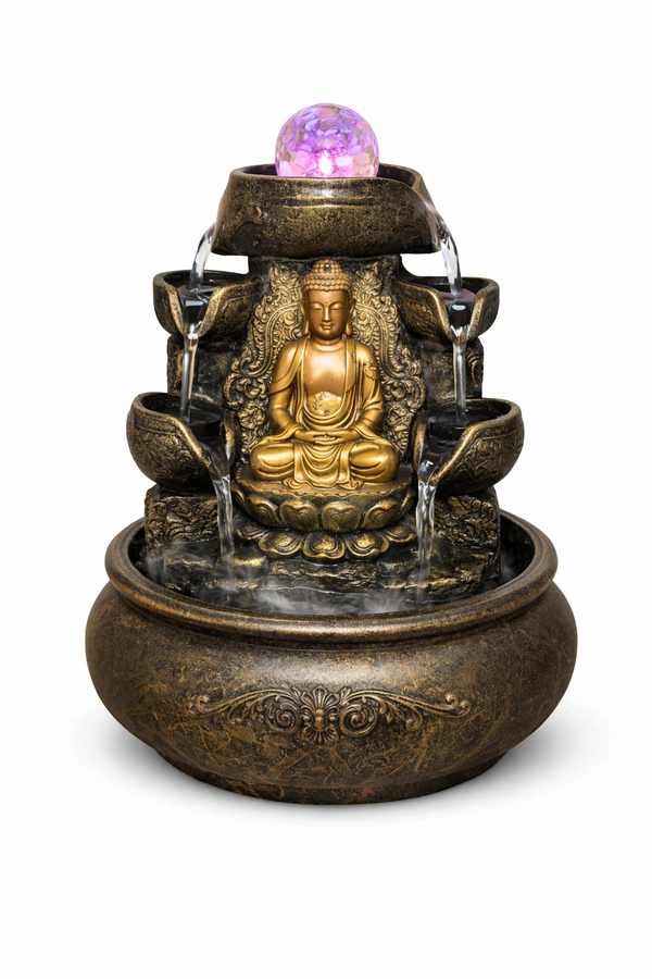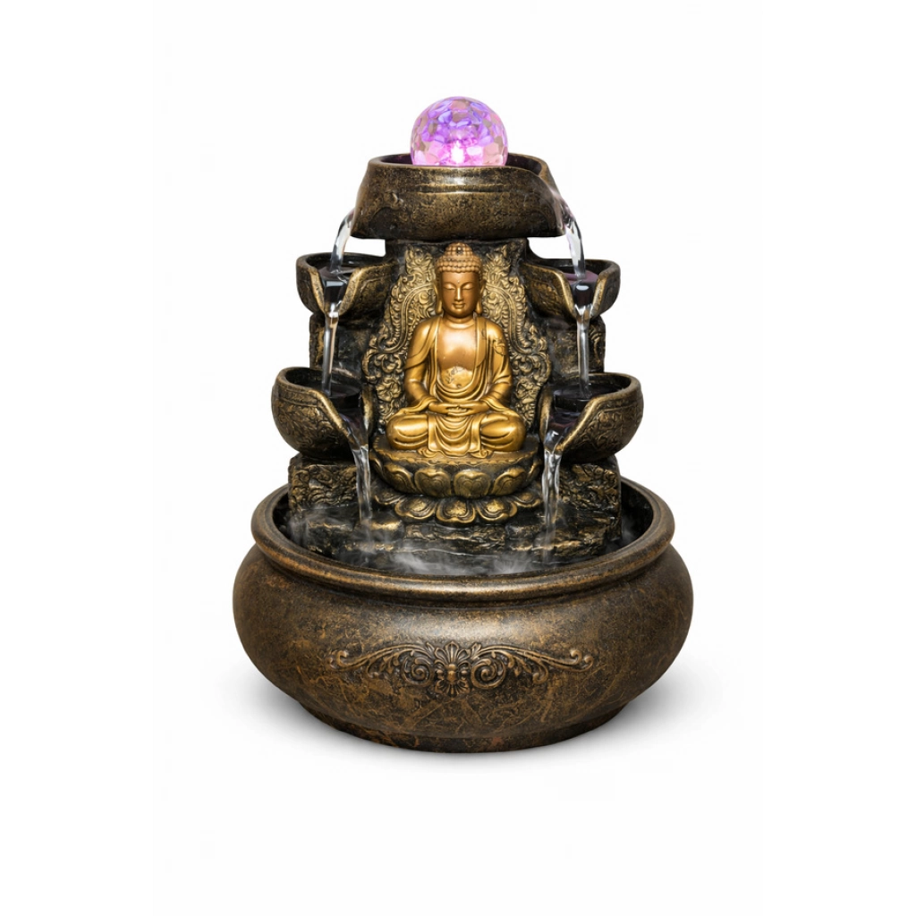 Fuente decorativa de agua estilo Buda con acabado dorado y efecto cascada, ideal para aportar equilibrio y serenidad a cualquier ambiente. Su diseño ornamental con esfera superior crea un flujo de agua relajante. Perfecta para decoración del hogar, oficina o espacios de meditación.