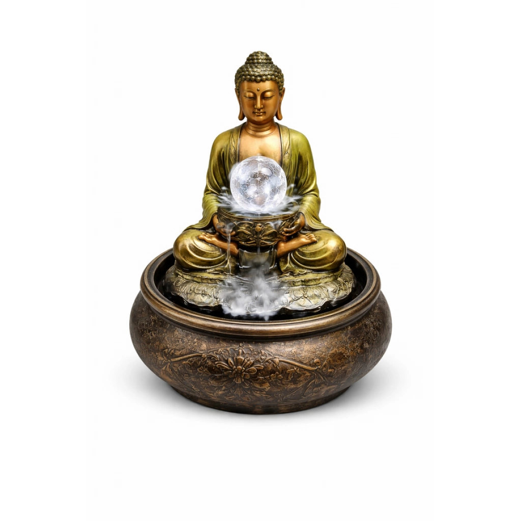 Fuente de agua ornamental ideal para crear un ambiente de calma y armonía. Presenta figura de Buda con esfera de cristal y efecto cascada, perfecta para el hogar u oficina. Diseño elegante, fácil de usar y de bajo consumo. Aporta relajación y estilo a cualquier espacio.