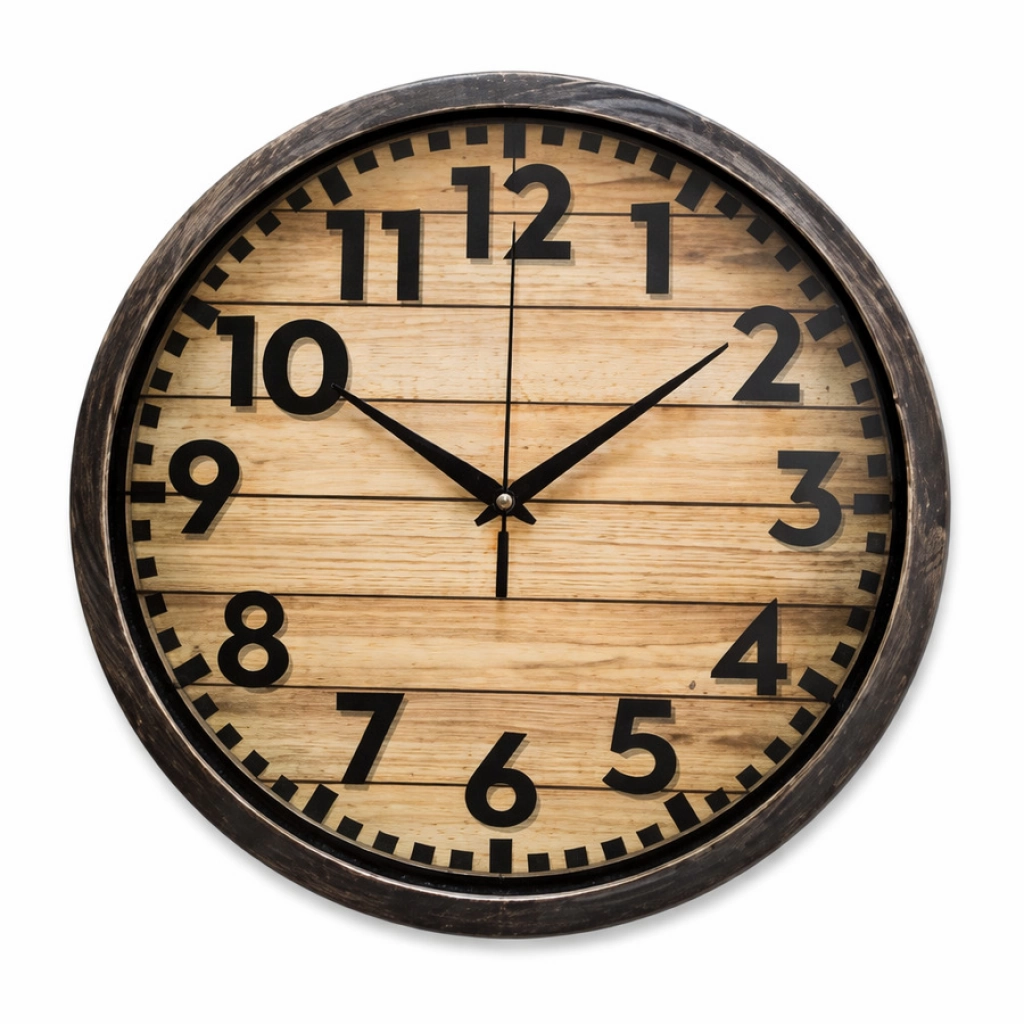 Reloj de pared estilo rústico con diseño redondo y acabado tipo madera. Números grandes y de alto contraste para una lectura clara. Ideal para living, cocina u oficina, aporta un toque cálido y decorativo combinando funcionalidad y estilo clásico.