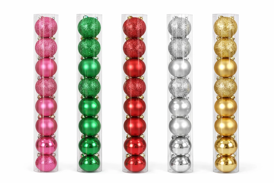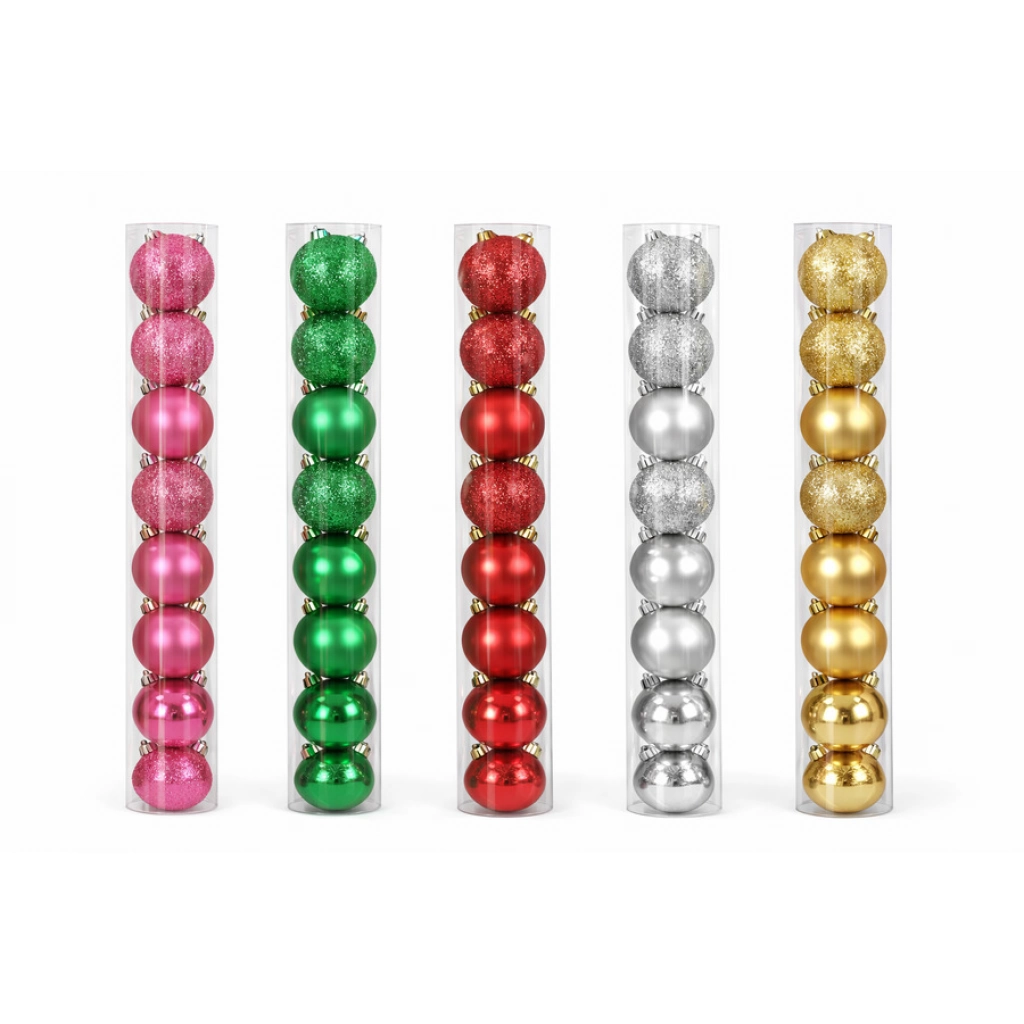 Set de esferas decorativas ideal para Navidad. Incluye 12 unidades por tubo: 6 con brillantina y 6 lisas, combinando brillo y elegancia. Disponible en rosado, verde, rojo, plateado y dorado. Perfectas para árbol, guirnaldas o centros decorativos.