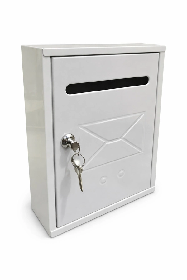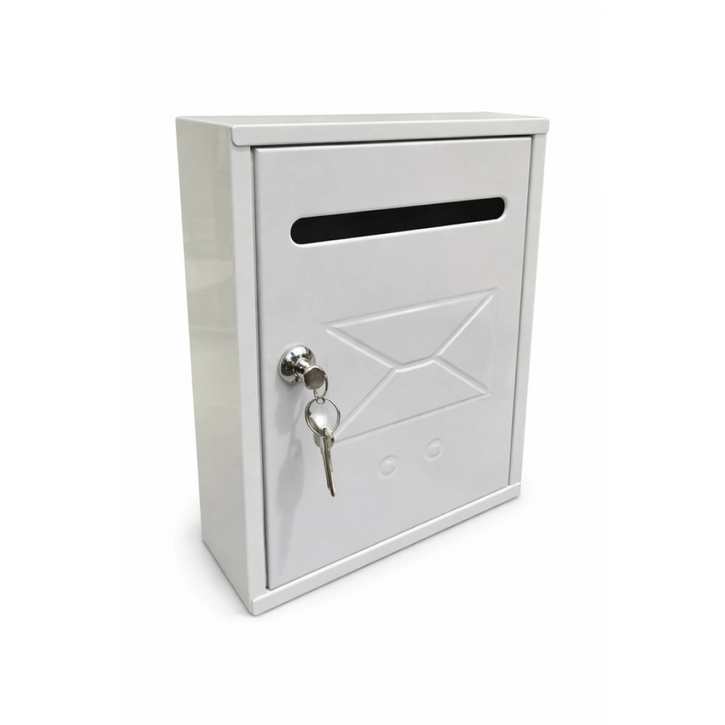 Buzón fabricado en metal resistente, ideal para exterior o interior. Cuenta con ranura superior para cartas, puerta frontal con cerradura y llaves incluidas para mayor seguridad. Diseño clásico en color blanco, práctico y duradero para el resguardo de correspondencia. Ideal para hogares, oficinas o edificios.