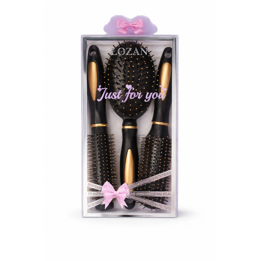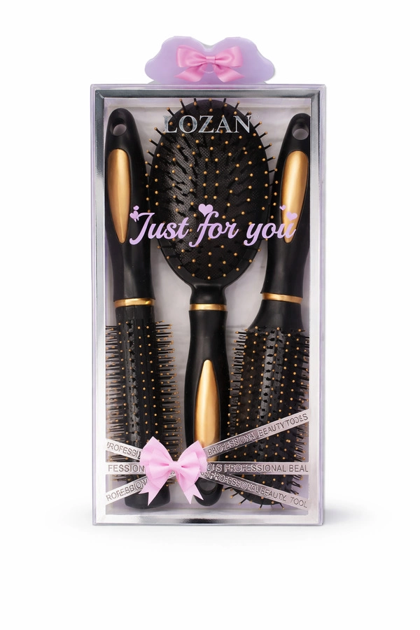 Set con 3 artículos: 1 cepillo, 1 peine y 1 peine para brushing. Ideal para desenredar, alisar y peinar fácilmente. Presentación en caja regalo. ?