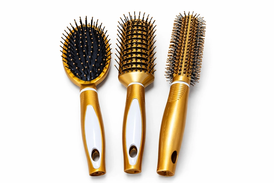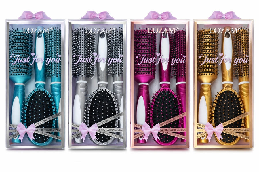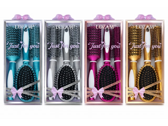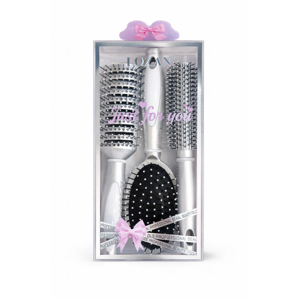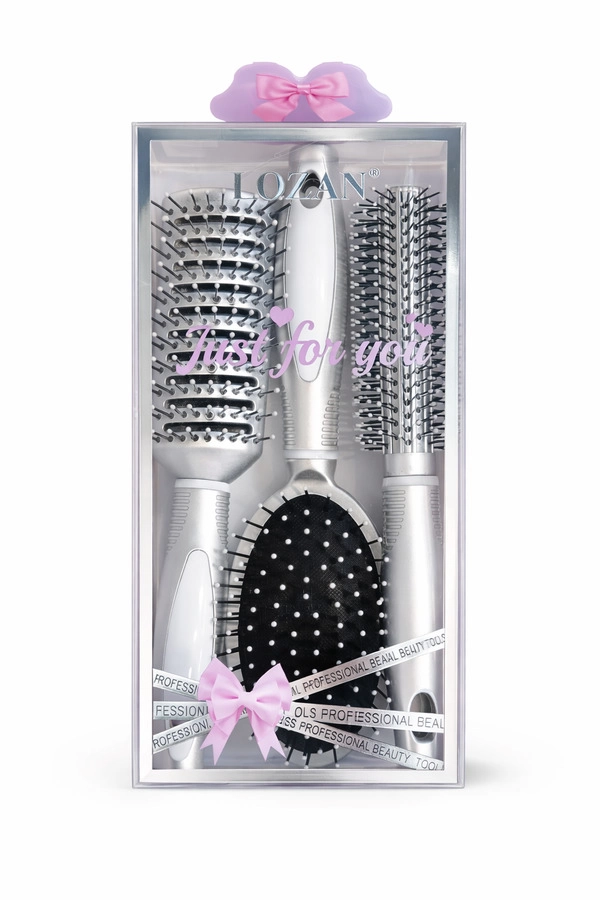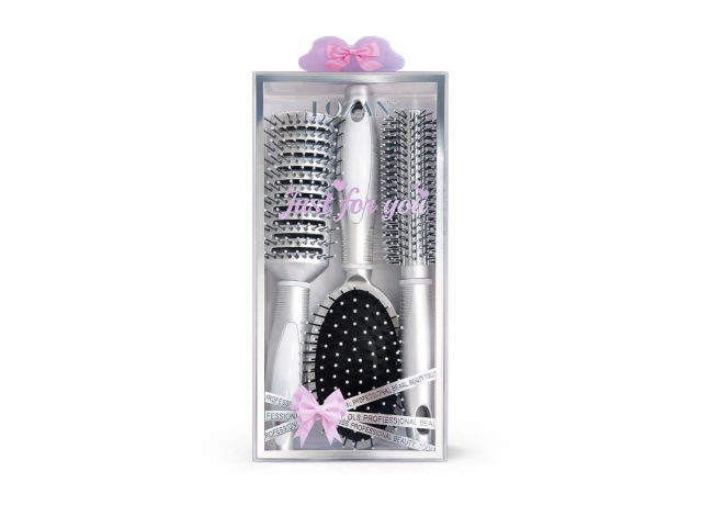 Set de 3 cepillos para el cabello de diseño profesional, ideales para desenredar, alisar y dar volumen. Incluye cepillo plano, cepillo ventilado y cepillo redondo COLORES DISPONIBLES: -VERDE -PLATEADO´ -ROSADO -DORADO LA CAJA CERRADA CONTIENE: 48 UNIDADES