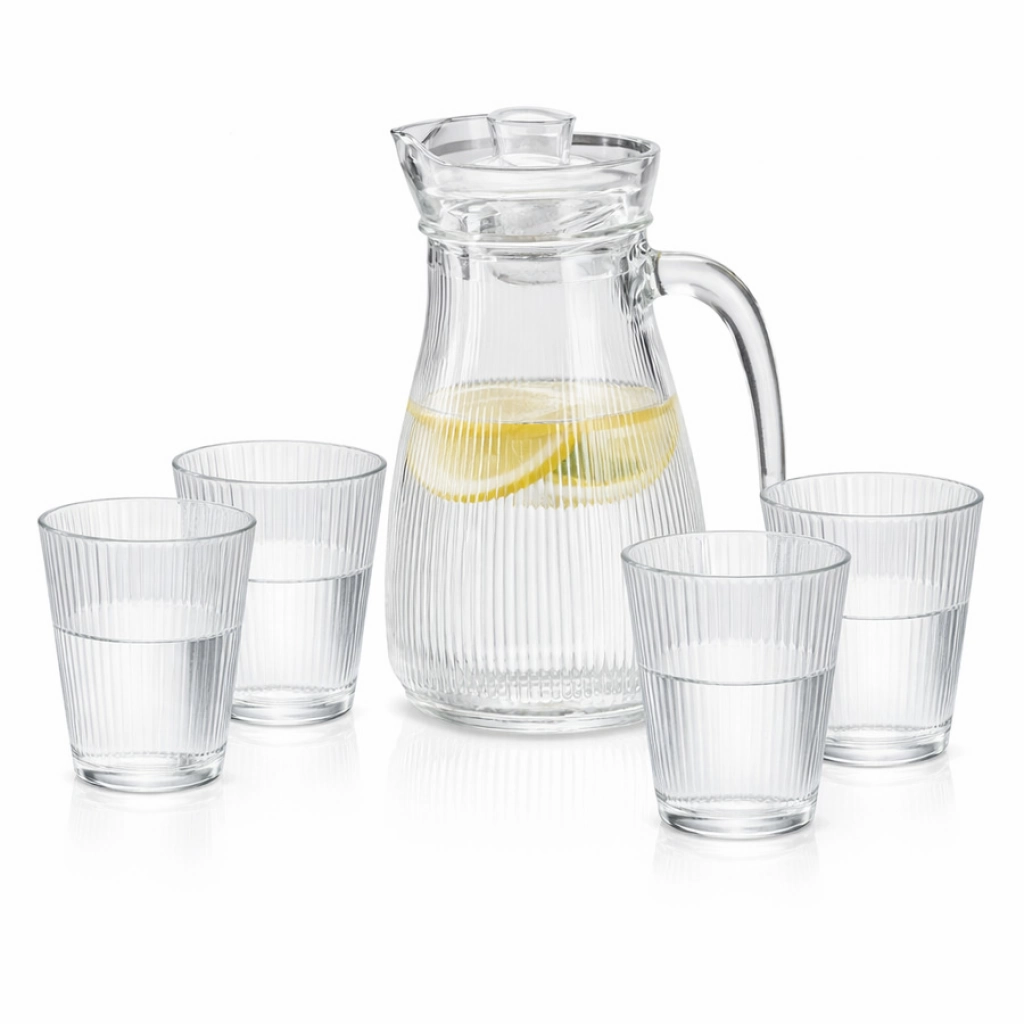Juego de jarra con tapa de 1000 ml y 4 vasos de 220 ml en vidrio. Diseño acanalado y elegante, ideal para agua, jugos o refrescos. Resistente, práctico y perfecto para uso diario.