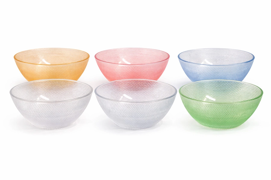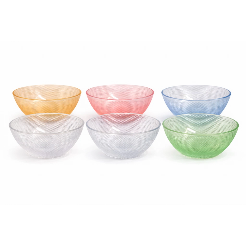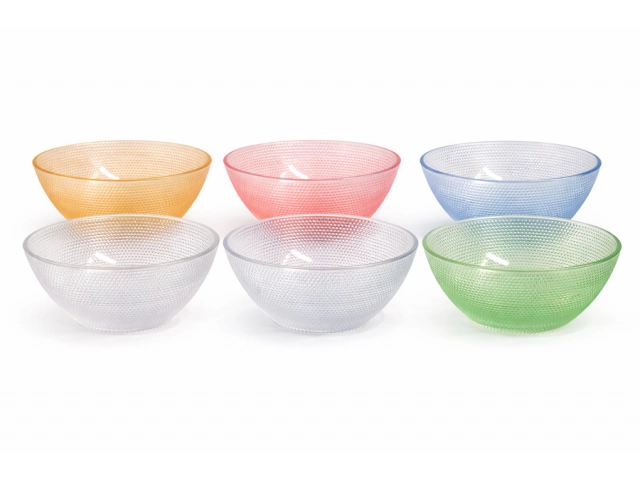 Juego de bowls fabricados en vidrio resistente con acabado texturado y colores translúcidos. Capacidad de 300 ml cada uno, ideales para postres, ensaladas, snacks o servicio de mesa. Diseño elegante, fácil de limpiar y apto para uso diario. Medidas: 12x5cm LA CAJA CONTIENE:16 UNIDADES