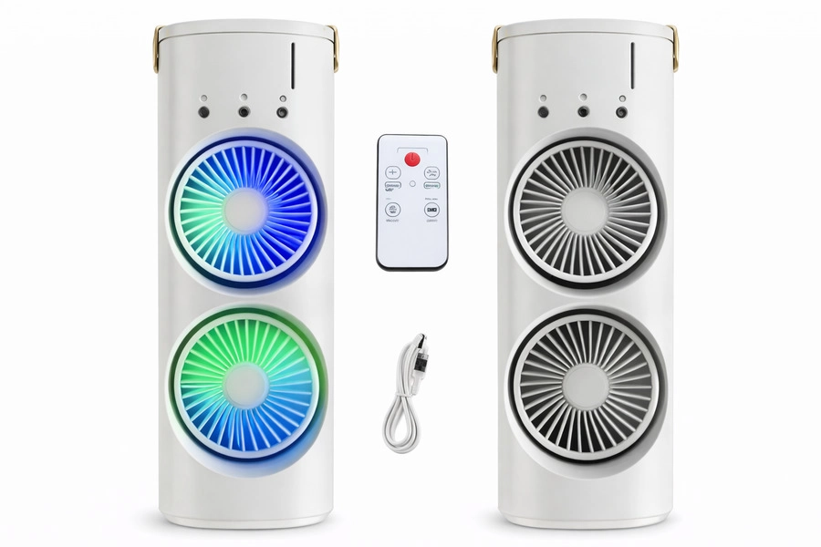 Ventilador doble con función humidificadora y control remoto. Recargable, con luz LED. Refresca y mejora el aire.
