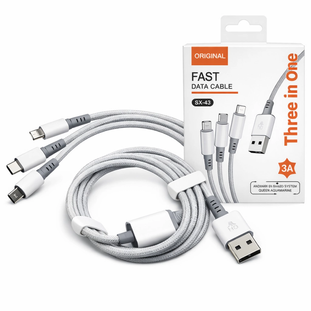 Cable usb 3 en 1 carga rapida conexión usb a 60w Medida: 1,2mts de largo CANTIDAD POR CAJA: 500 UNIDADES