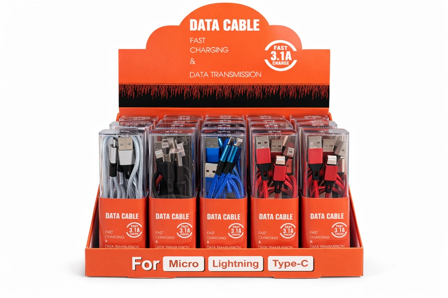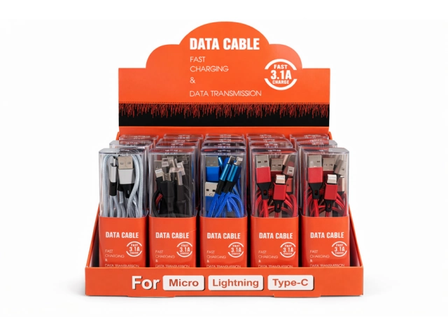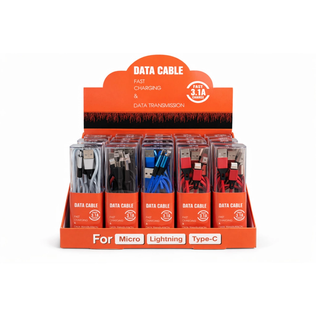 Cable multipuerto de carga rápida 3.1A, diseñado para ofrecer carga eficiente y transferencia de datos estable. Incluye conectores Micro USB, Type-C y Lightning, compatibles con la mayoría de smartphones y dispositivos electrónicos. DISPLAY DE: 12 UNIDADES CAJA CERRADA CONTIENE: 40 CAJAS DE 12 UNIDADES