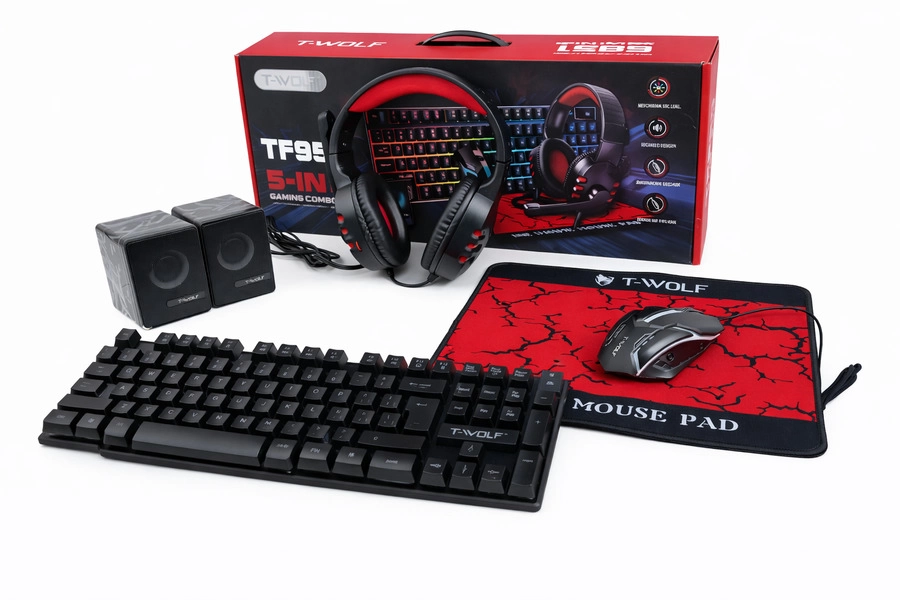 Combo Gamer 5 en 1 Teclado gamer Mouse gamer Audífonos gamer con micrófono Mouse pad y parlantes Ofrece iluminación, buena respuesta y un diseño completo para armar tu estación gamer.