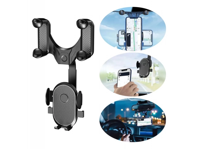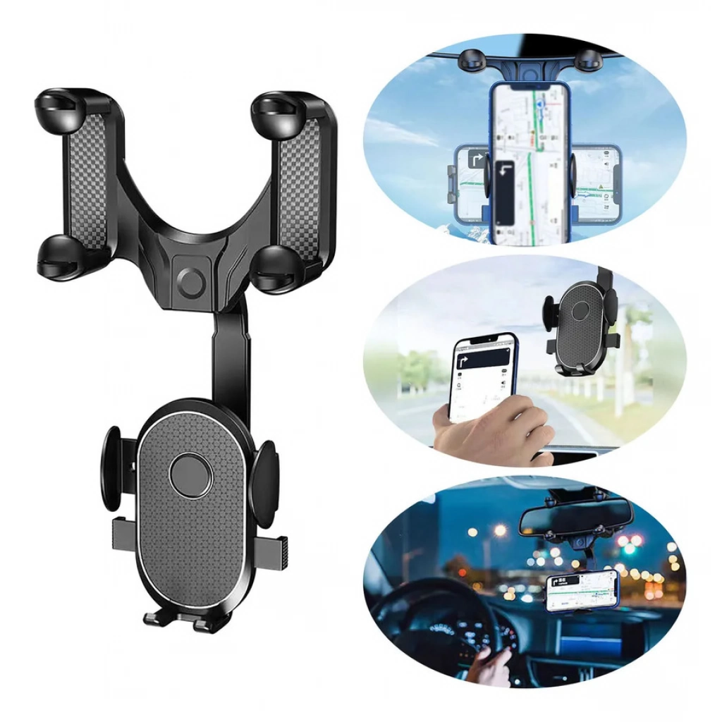 Soporte reforzado con doble gancho y fijación segura. Se adapta al tablero, espejo retrovisor o rejilla de ventilación. Estable y resistente.
