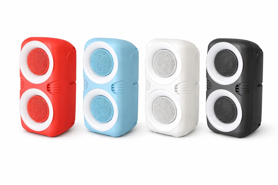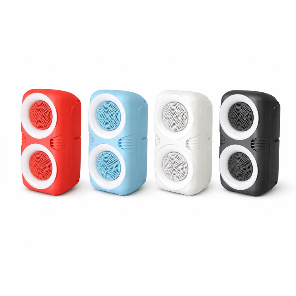 Parlante portátil con luces LED y diseño moderno. Buen sonido y volumen ideal para reuniones o uso diario. Compacto, práctico y fácil de trasladar. Bocina de 4''