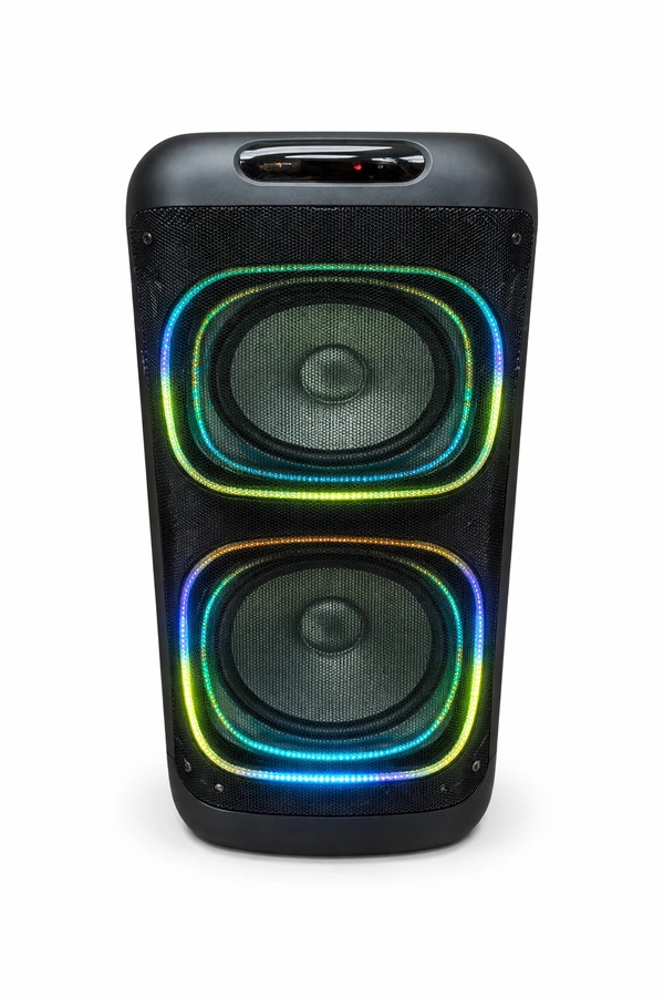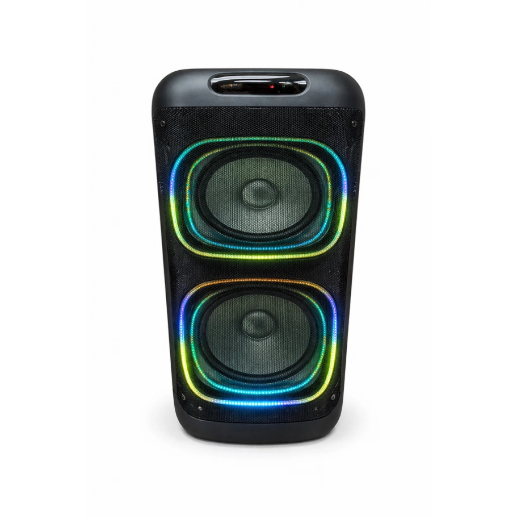 PARLANTE BOCINA DOBLE 10" Potencia: 60W Configuración: 2 altavoces de 10 pulgadas, imán 90 + altavoz de agudos Batería: 11,1V / 4500mAh Accesorios: doble micrófono inalámbrico recargable por Bluetooth (con batería) + mando a distancia grande + adaptador 13,5V 1,5A Funciones: USB, tarjeta TF, Bluetooth, pantalla, FM, TWS Medida: 350x375x855mm CANTIDAD POR CAJA: 1 UNIDADES