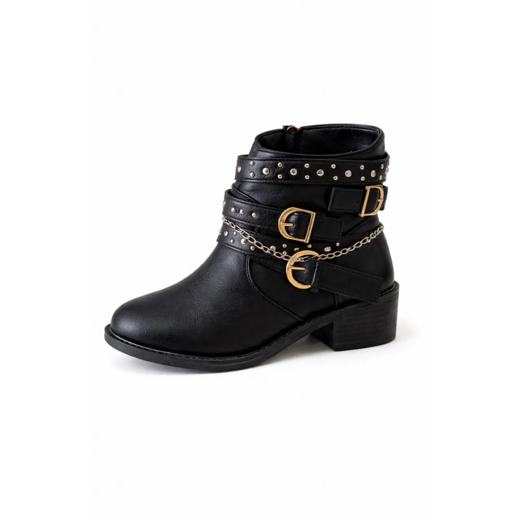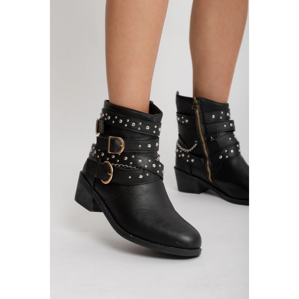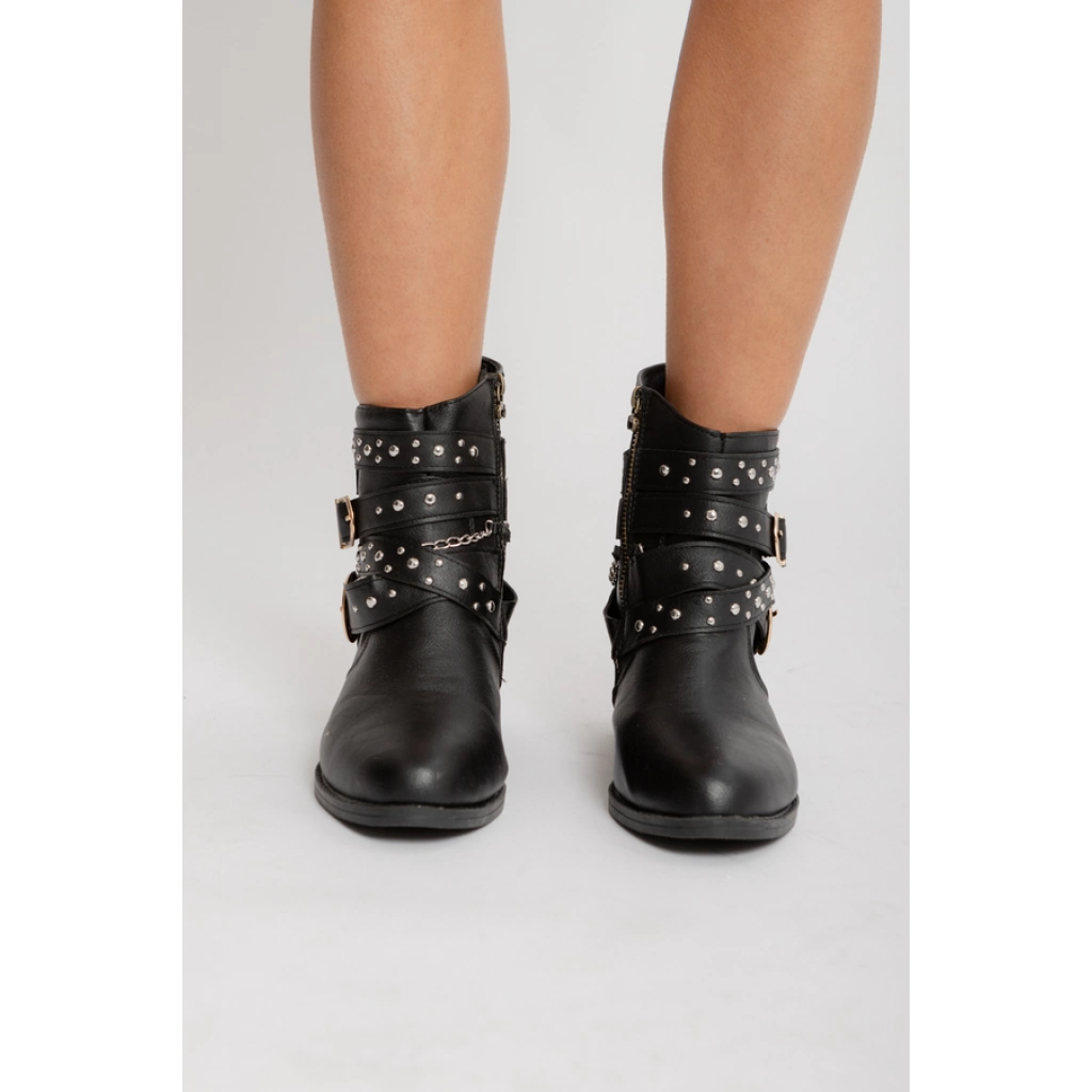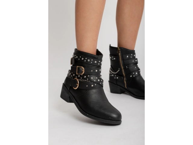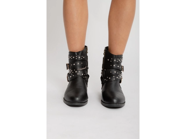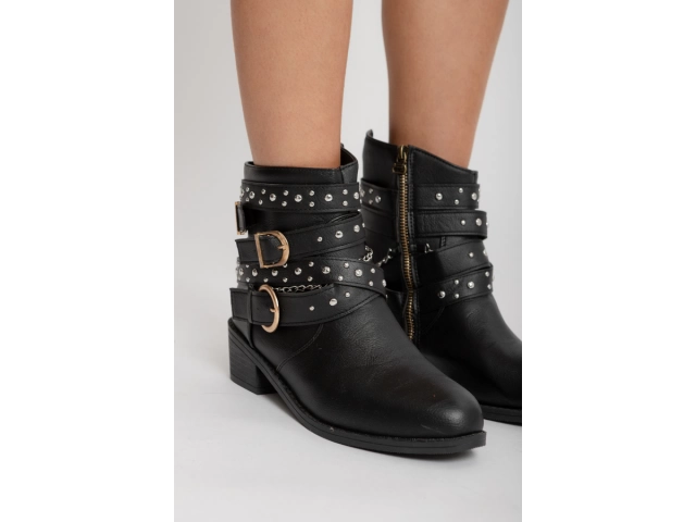Bota corta de cuero sintético negro, con detalle de hebilla lateral. Base plana.