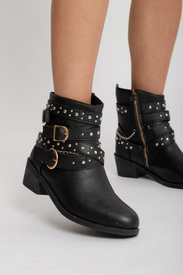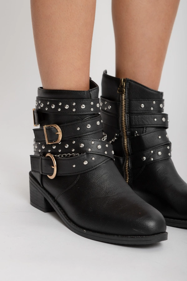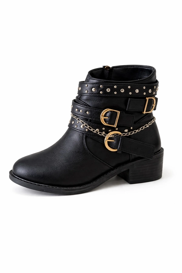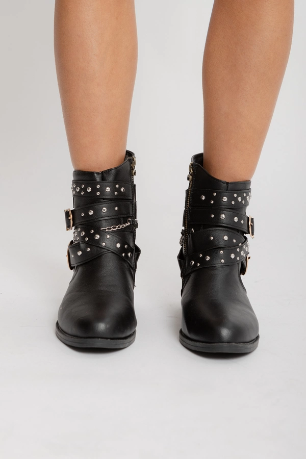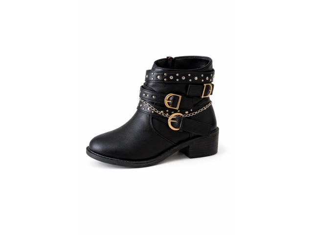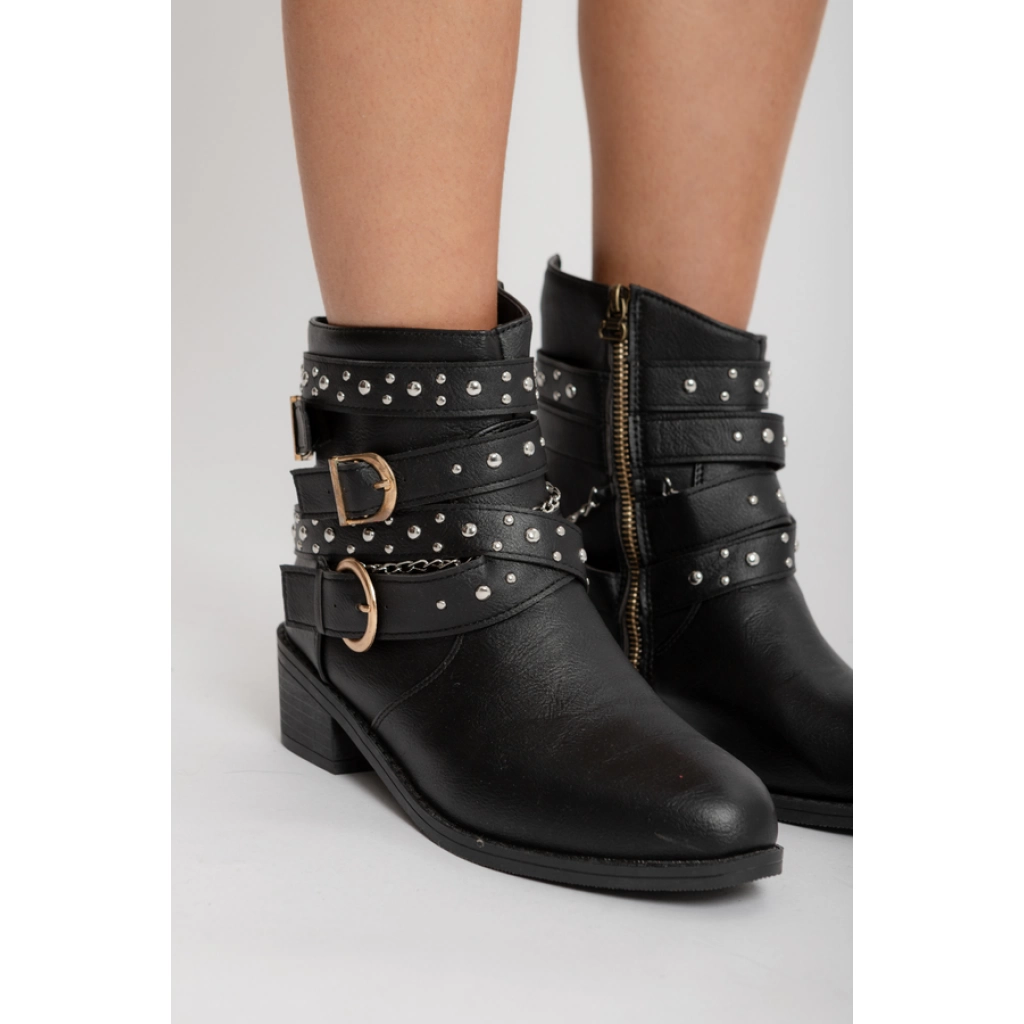 Bota corta de cuero sintético negro, con detalle de hebilla lateral. Base plana.