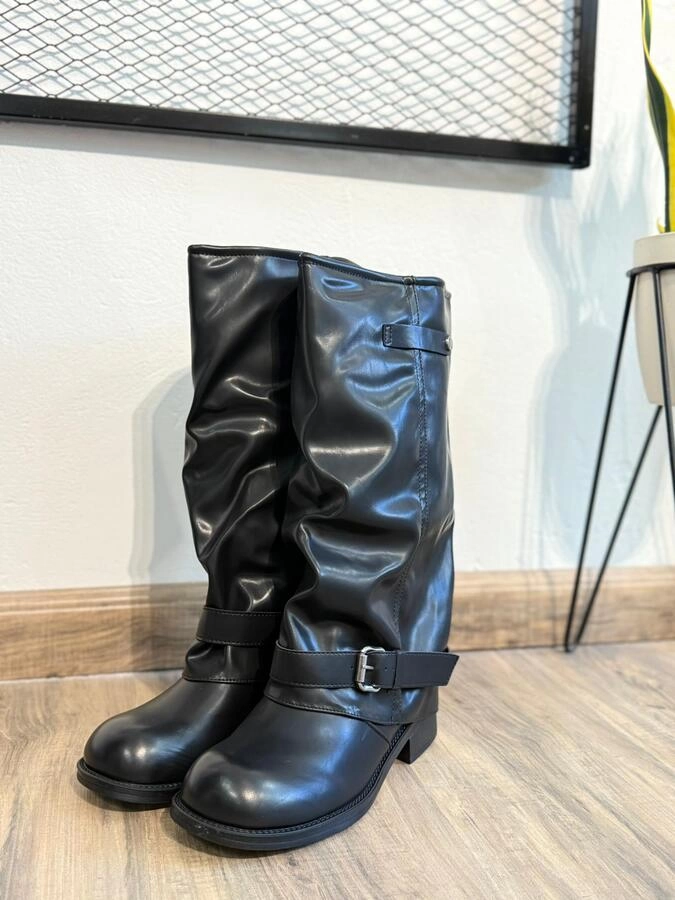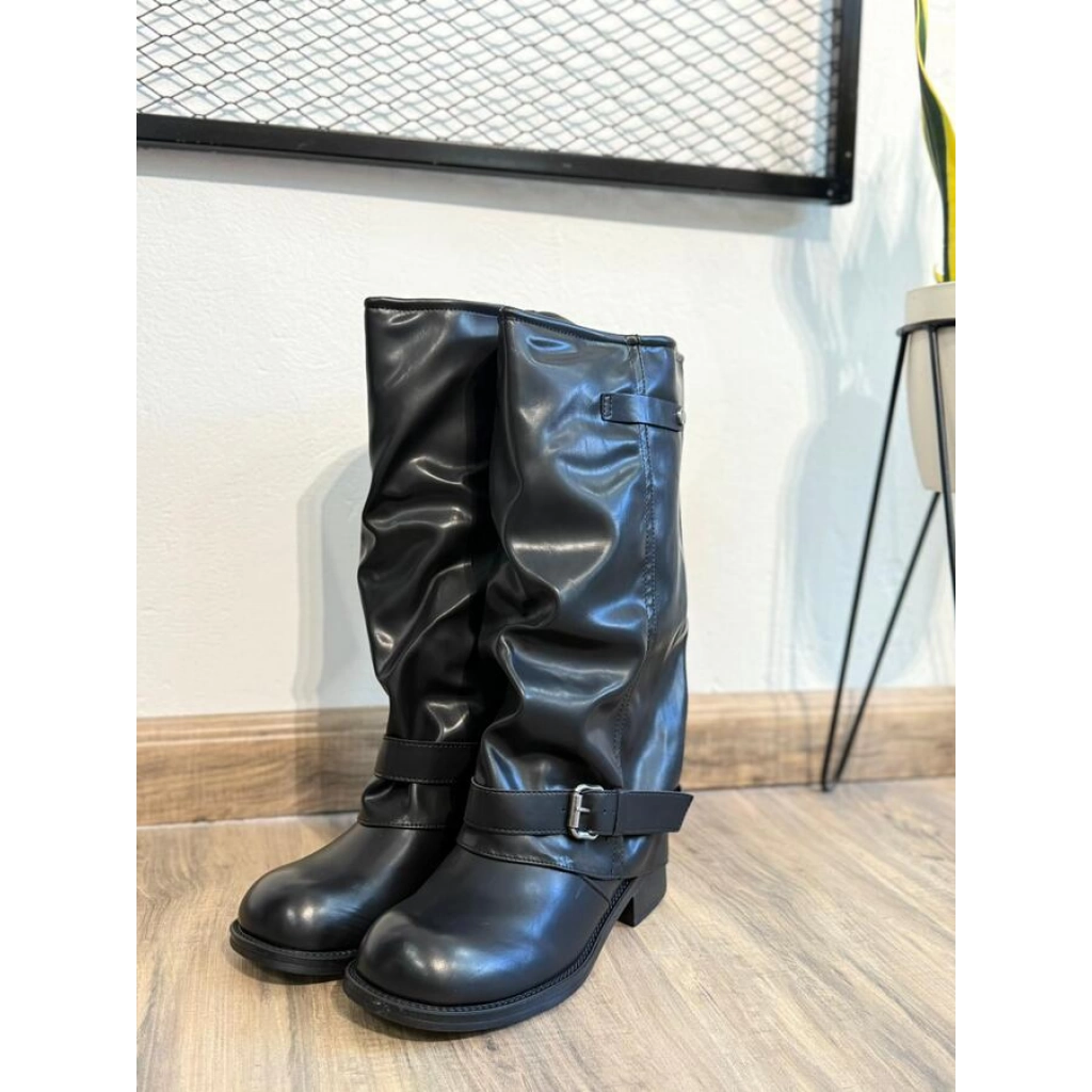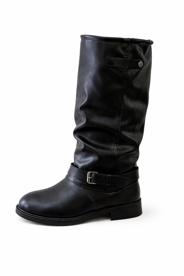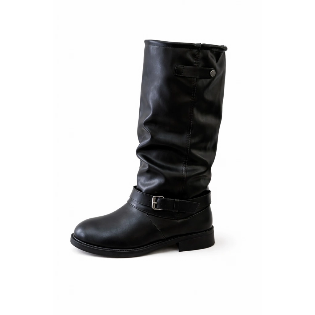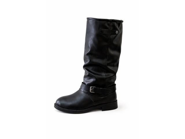Bota corta de cuero sintético negro, con detalle de hebilla lateral. Base plana.