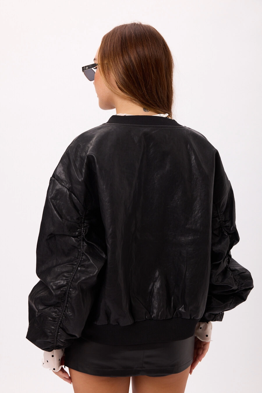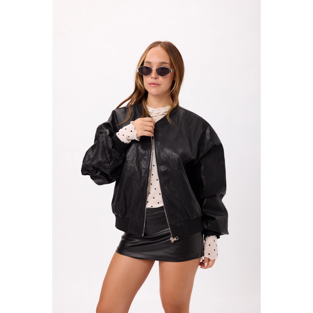Campera bomber de eco cuero con cierre frontal y puños elastizados. Color: negro.