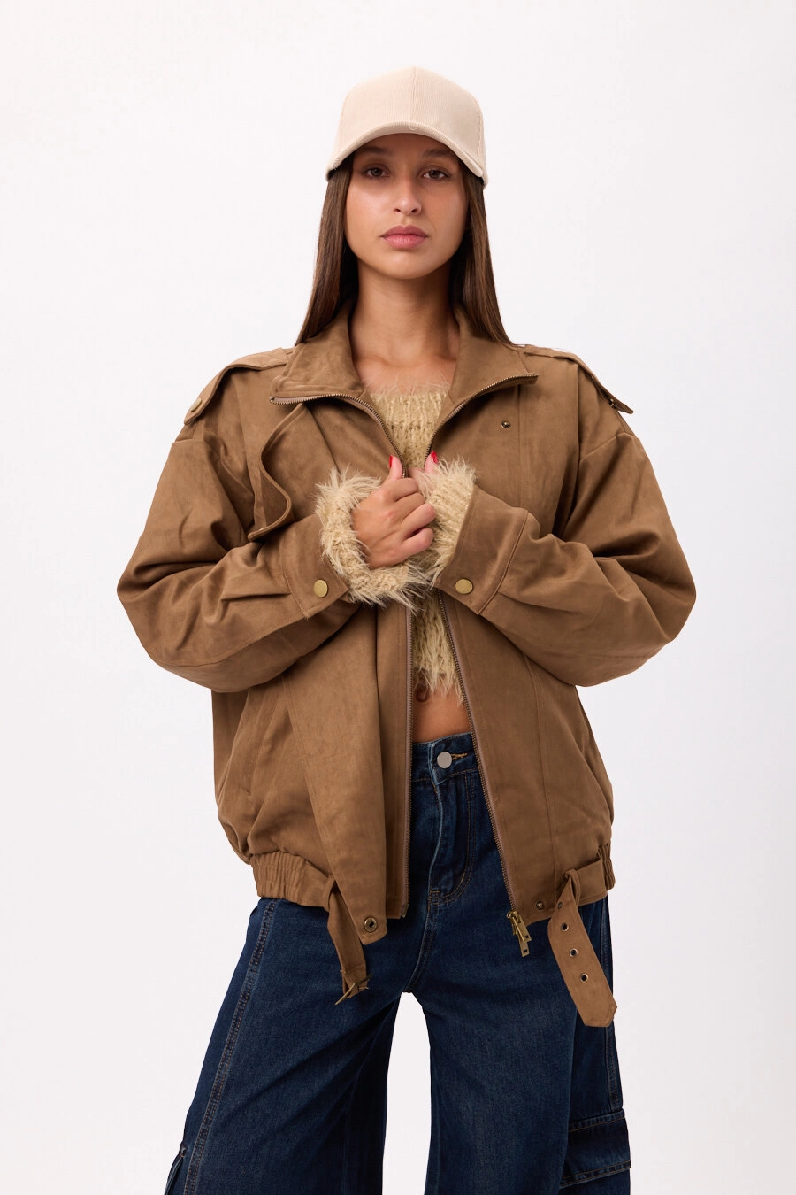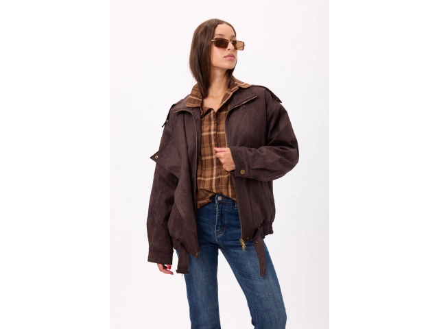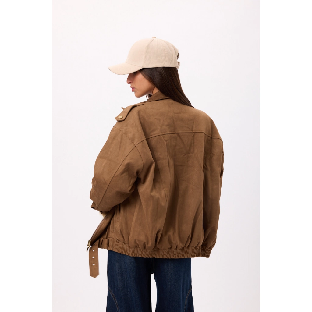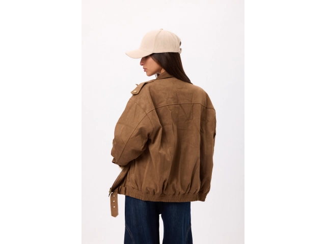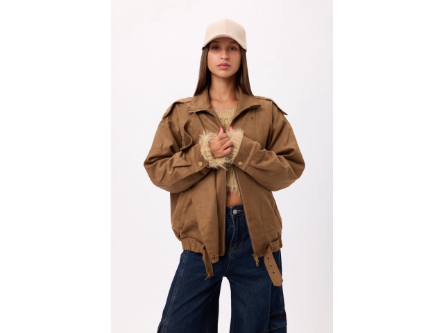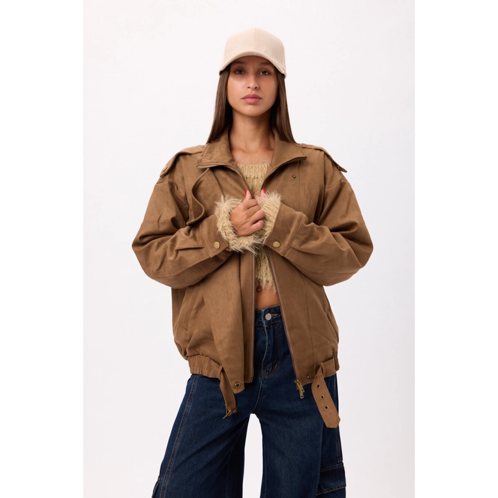 Campera estilo suede/gamuza con cierre frontal y ajuste en cintura. Disponible en negro y camel