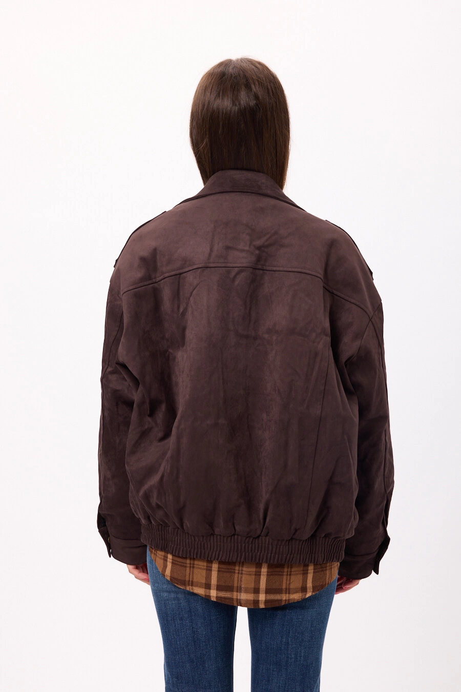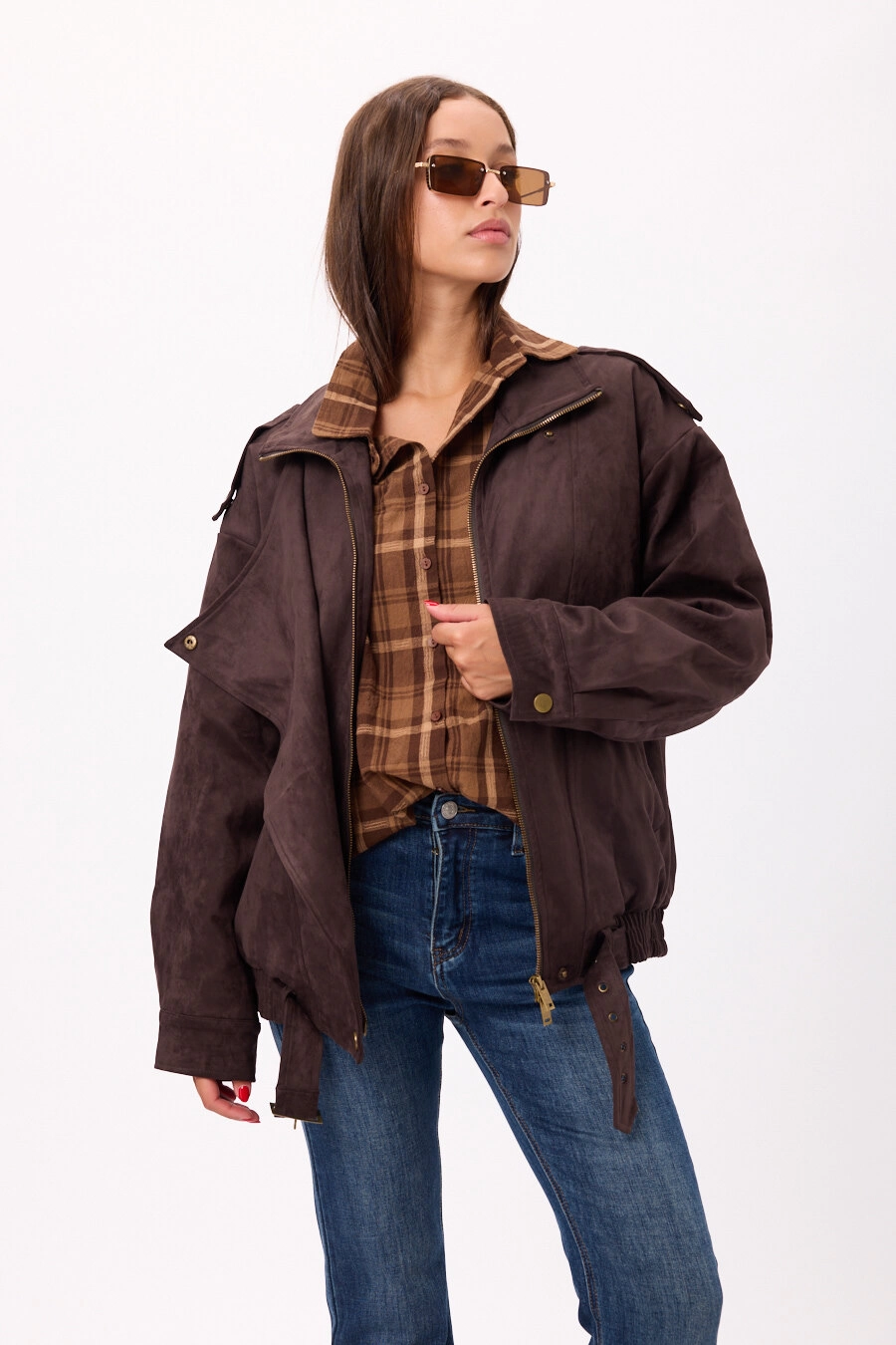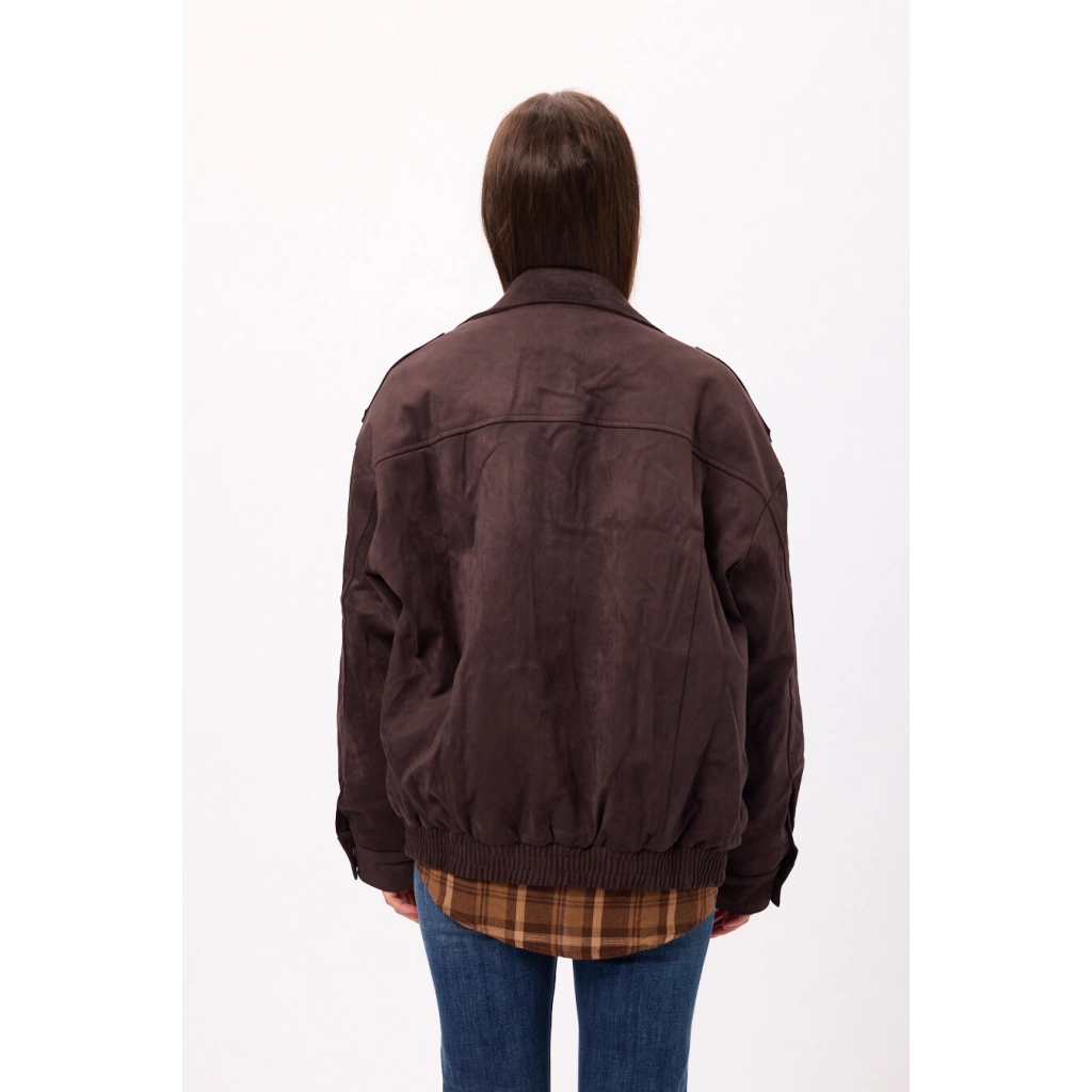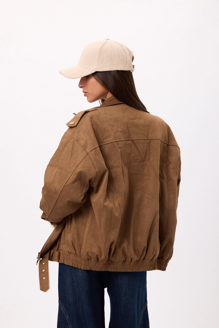 Campera estilo suede/gamuza con cierre frontal y ajuste en cintura. Disponible en negro y camel