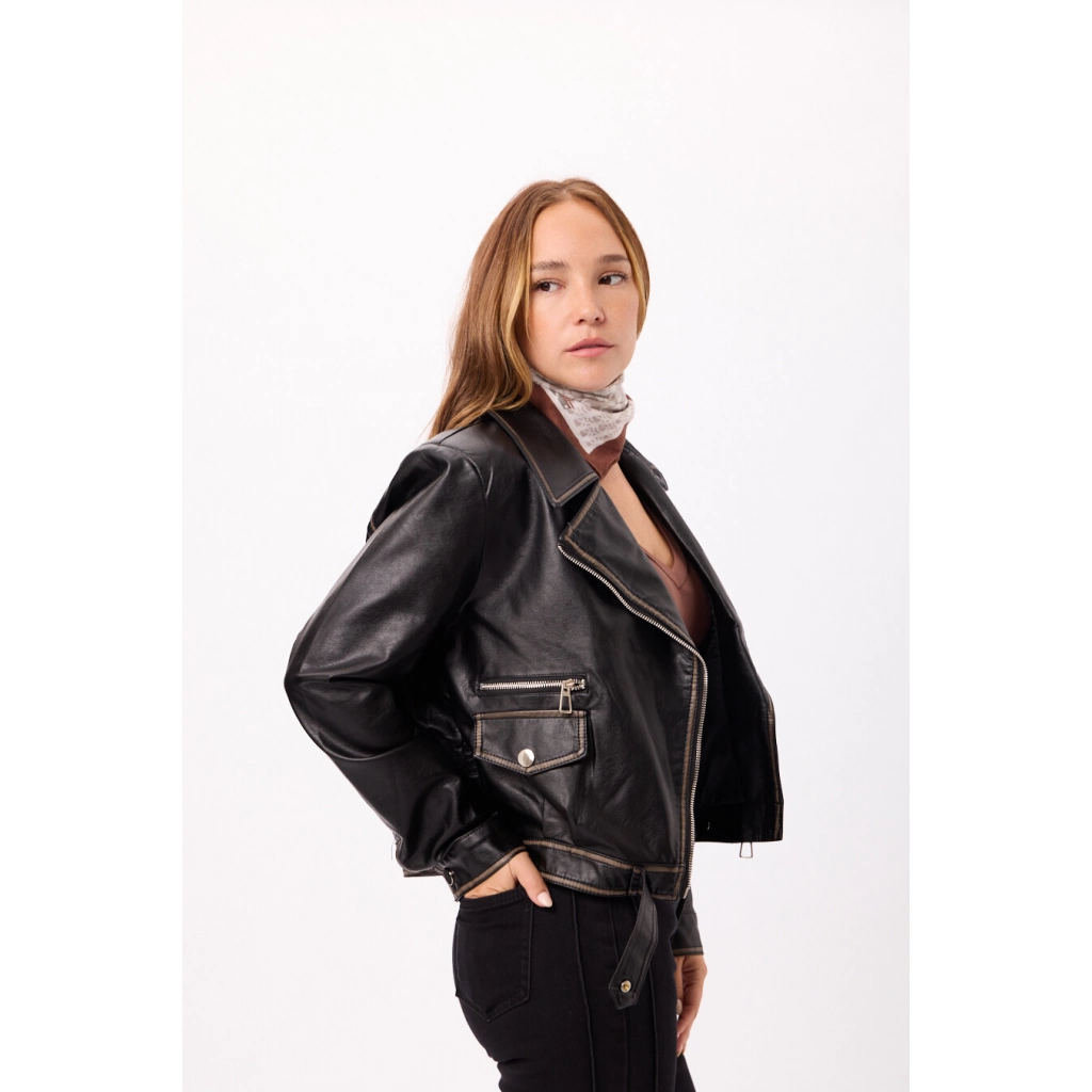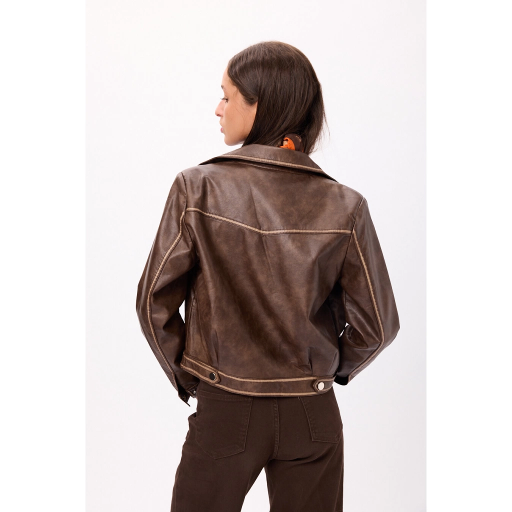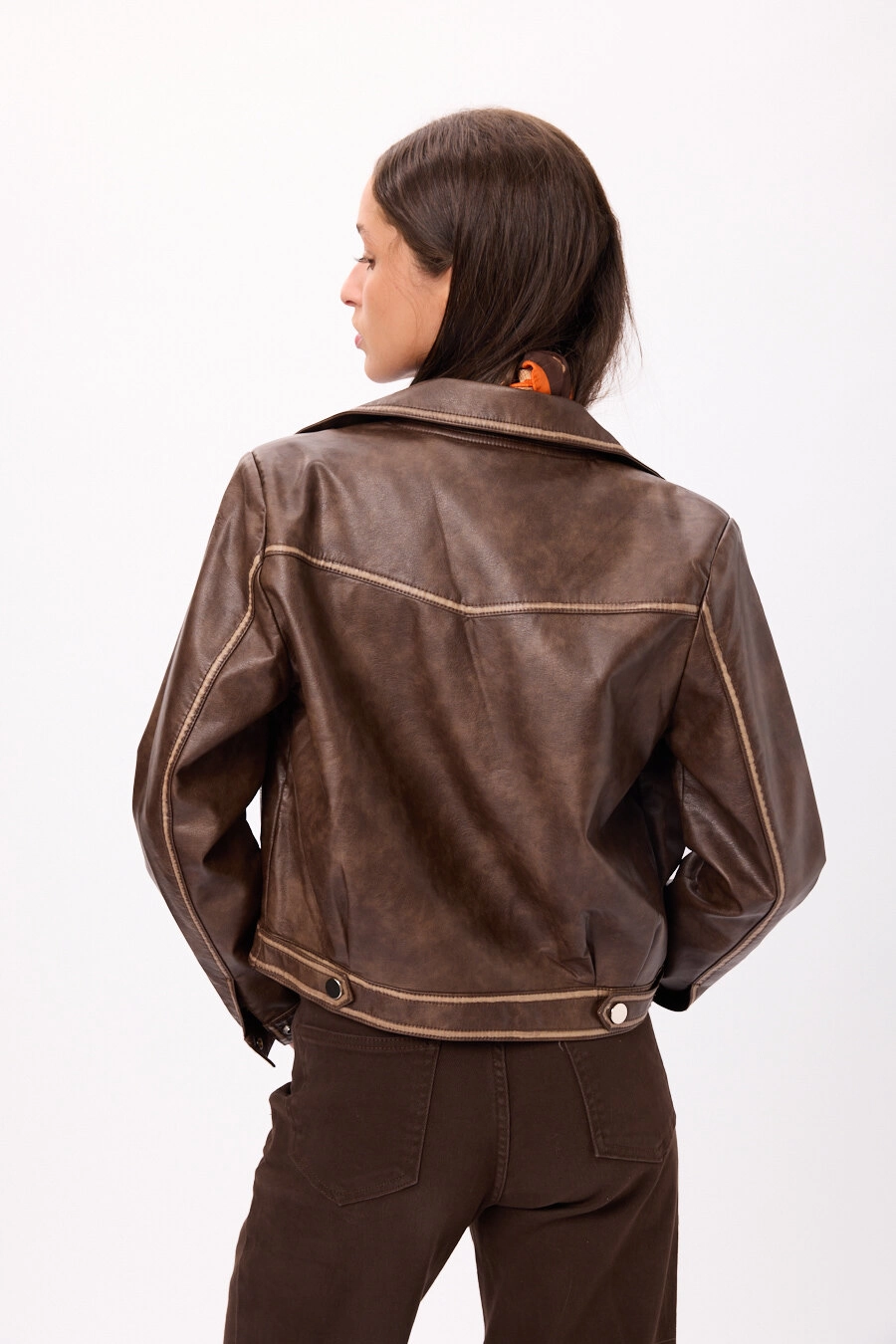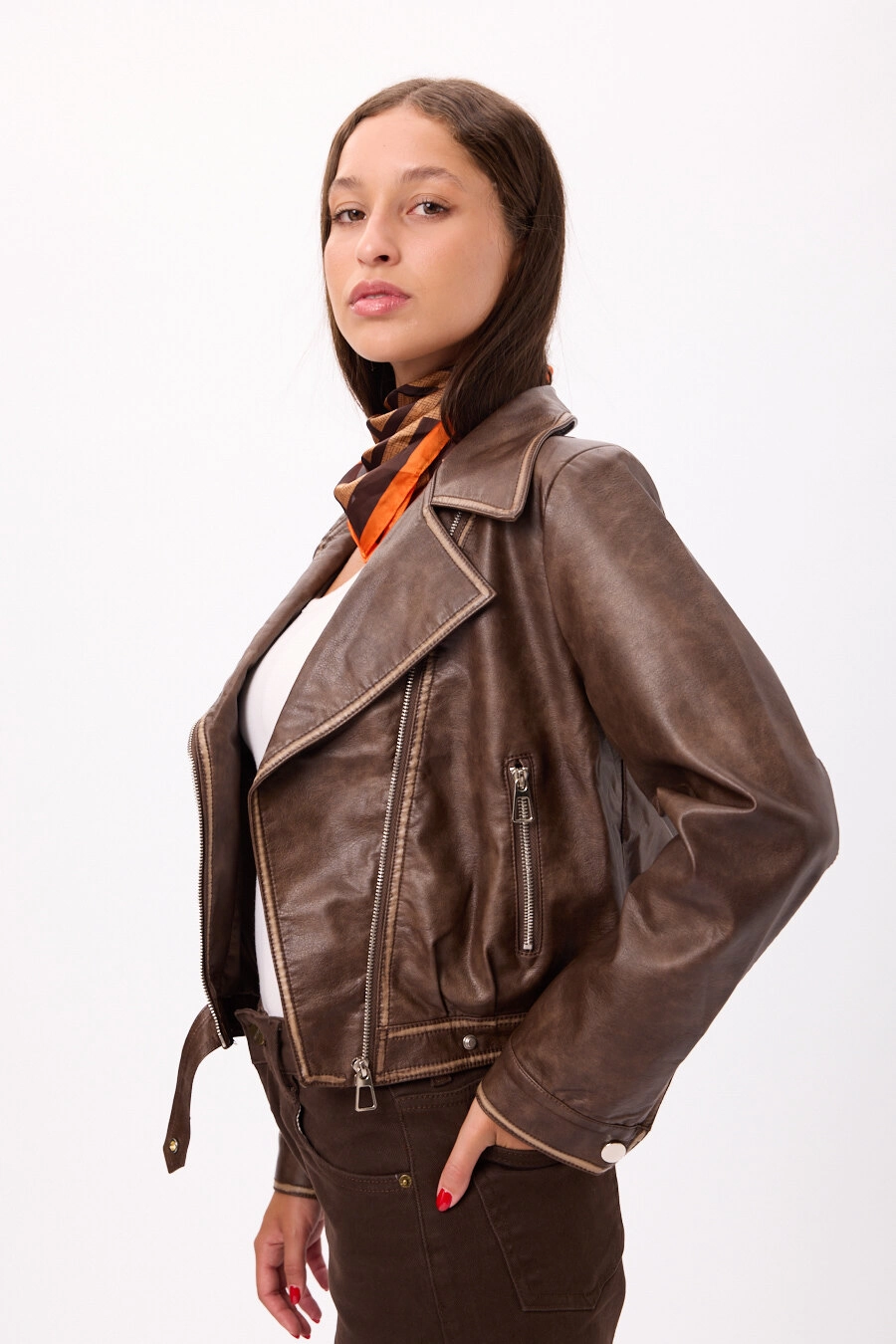 Campera biker de eco cuero con cierres y detalles metálicos Colores: marrón y negro. Talles: M/L/XL.