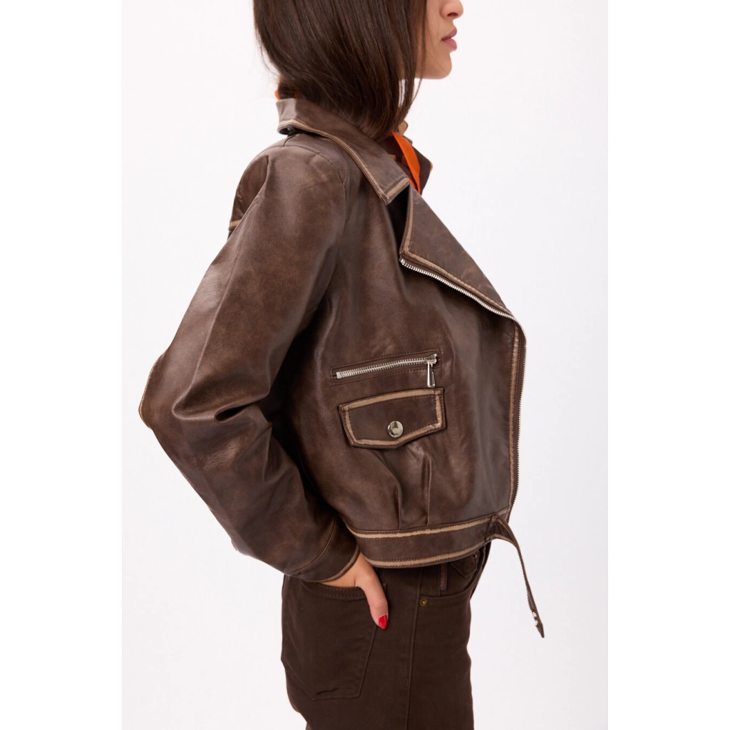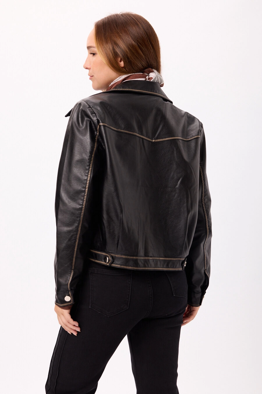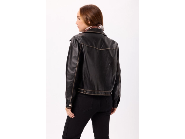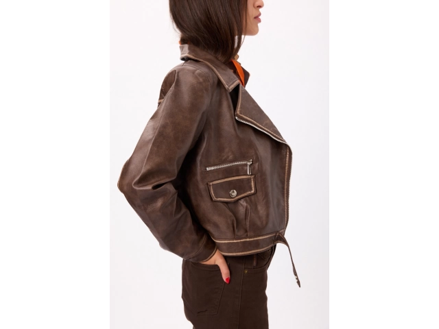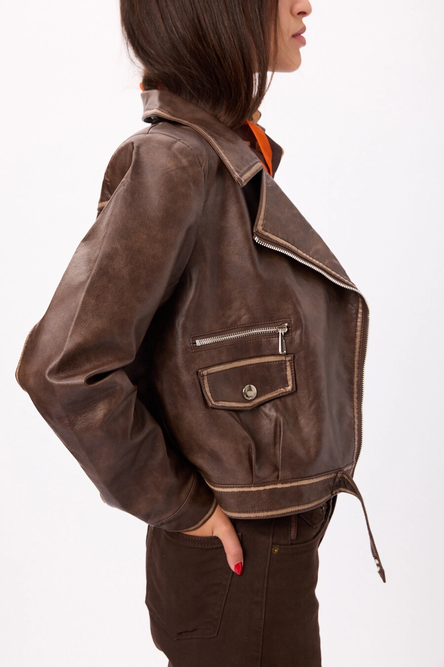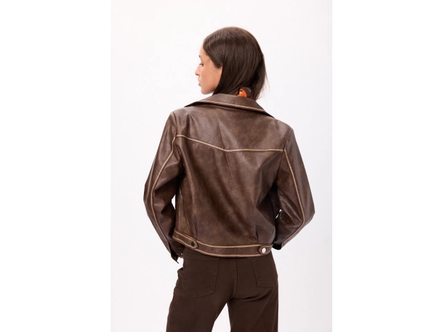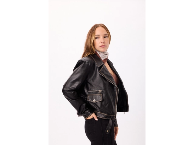 Campera biker de eco cuero con cierres y detalles metálicos Colores: marrón y negro. Talles: M/L/XL.