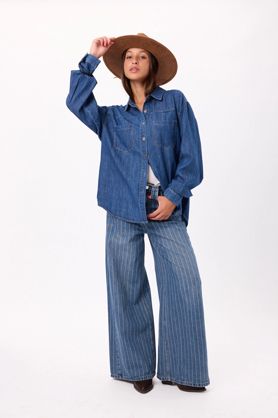 Camisa de jean oversize, manga larga, botones frontales, cuello camisero, 2 bolsillos delanteros. Talle único.