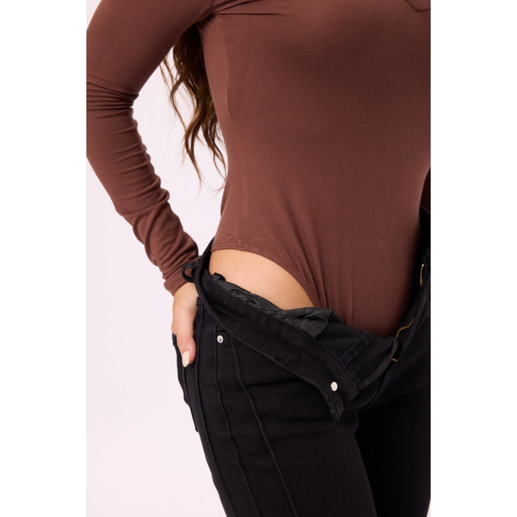 Pantalón acampanado para mujer en tono chocolate. Tela cómoda y con buen calce, ideal para estilizar la figura y complementar looks casuales o vestir.