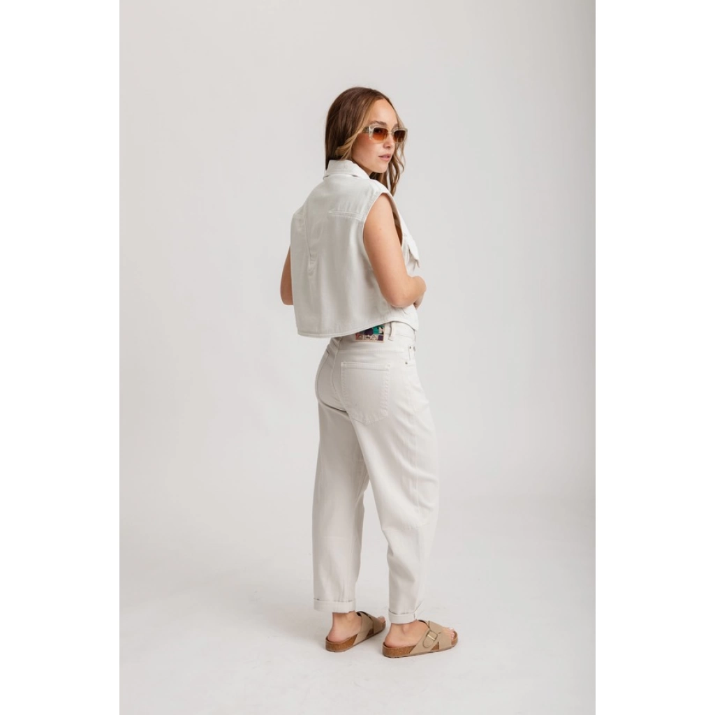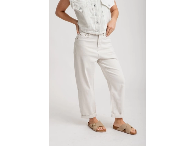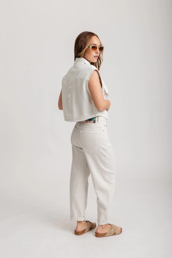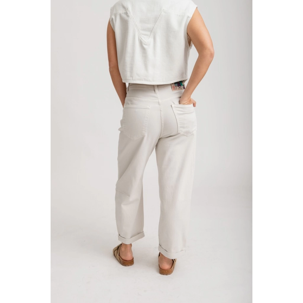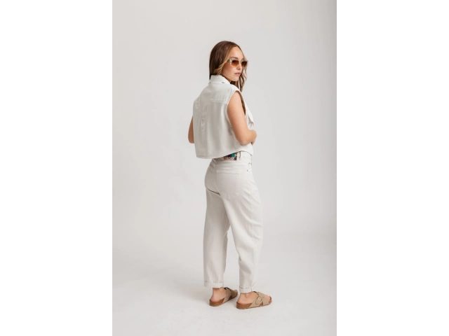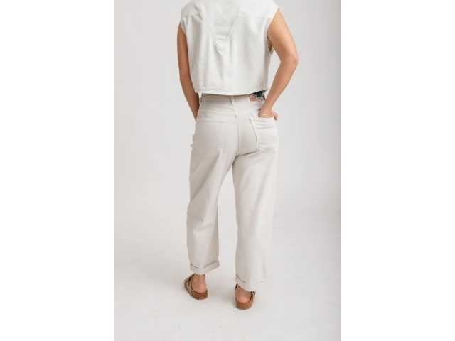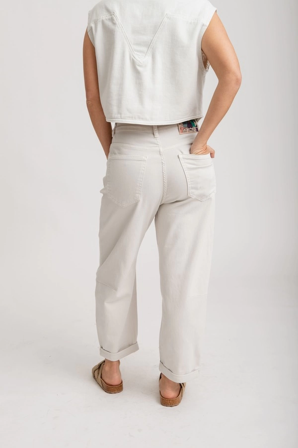 Tiro alto, con cintura anatómica. Diseño de pierna ancha tipo palazzo, terminación recta, sin desgastes.