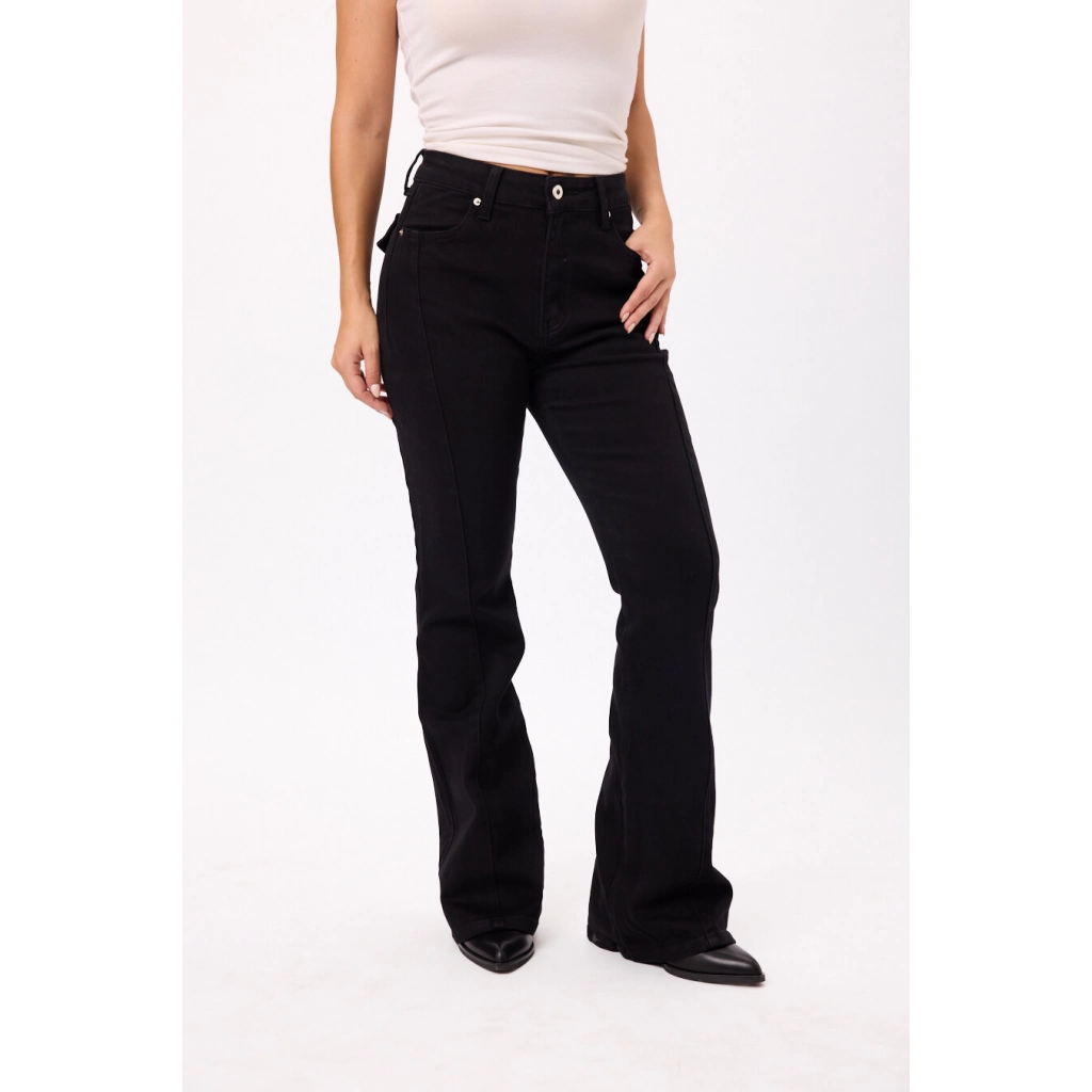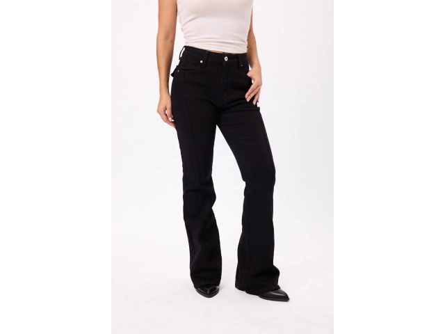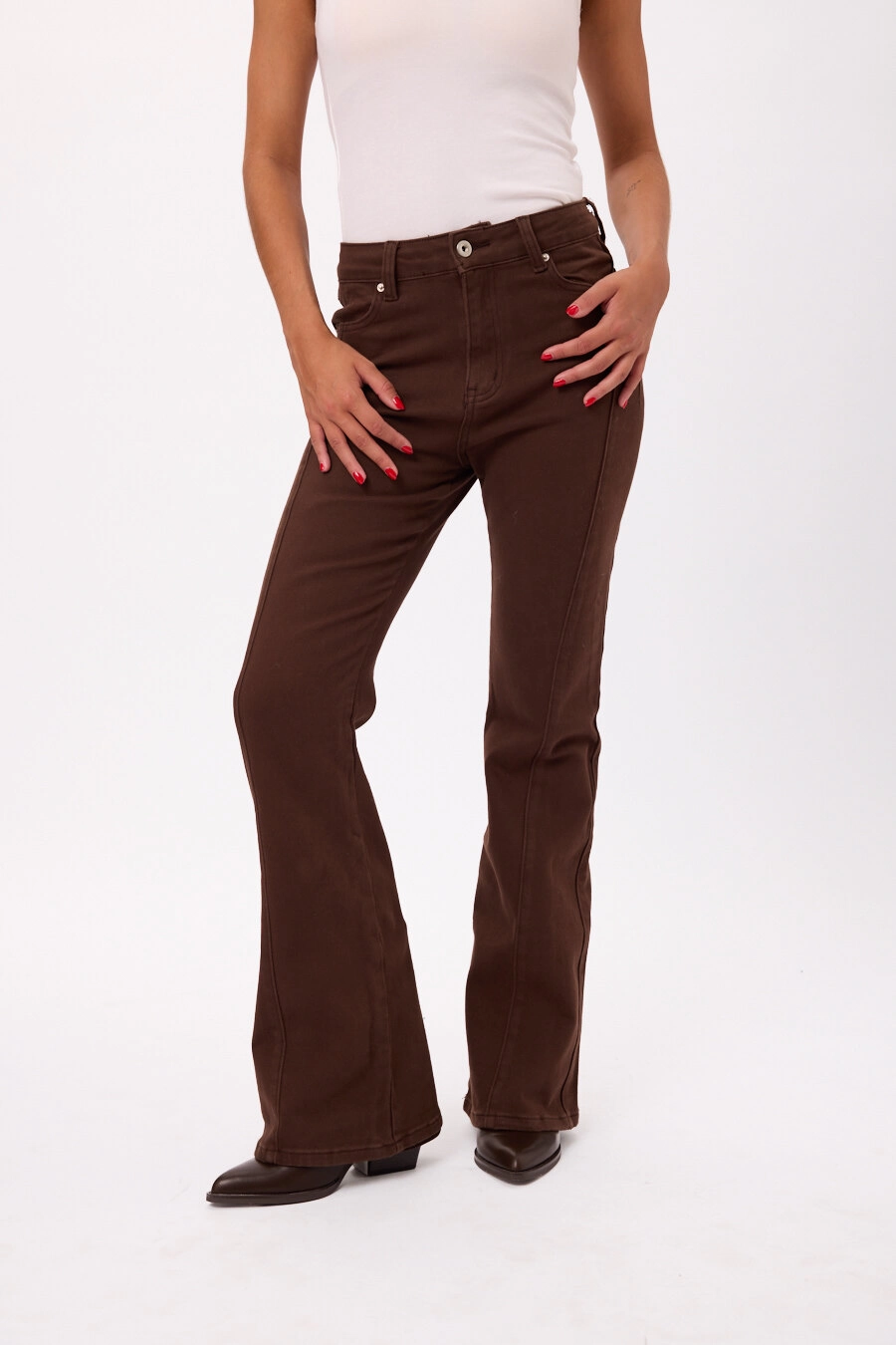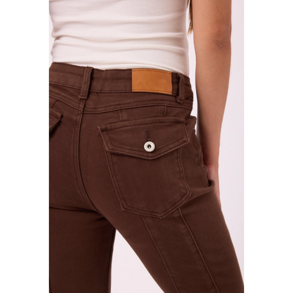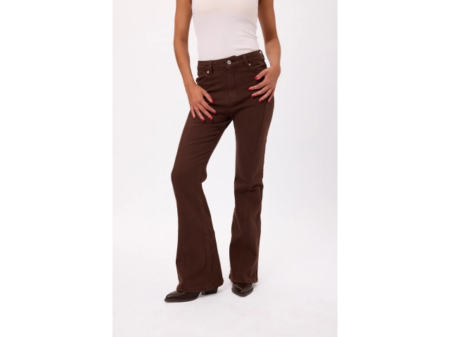 Pantalón tiro alto con pierna levemente acampanada Colores: negro y marrón. Talles S/M/L/XL.