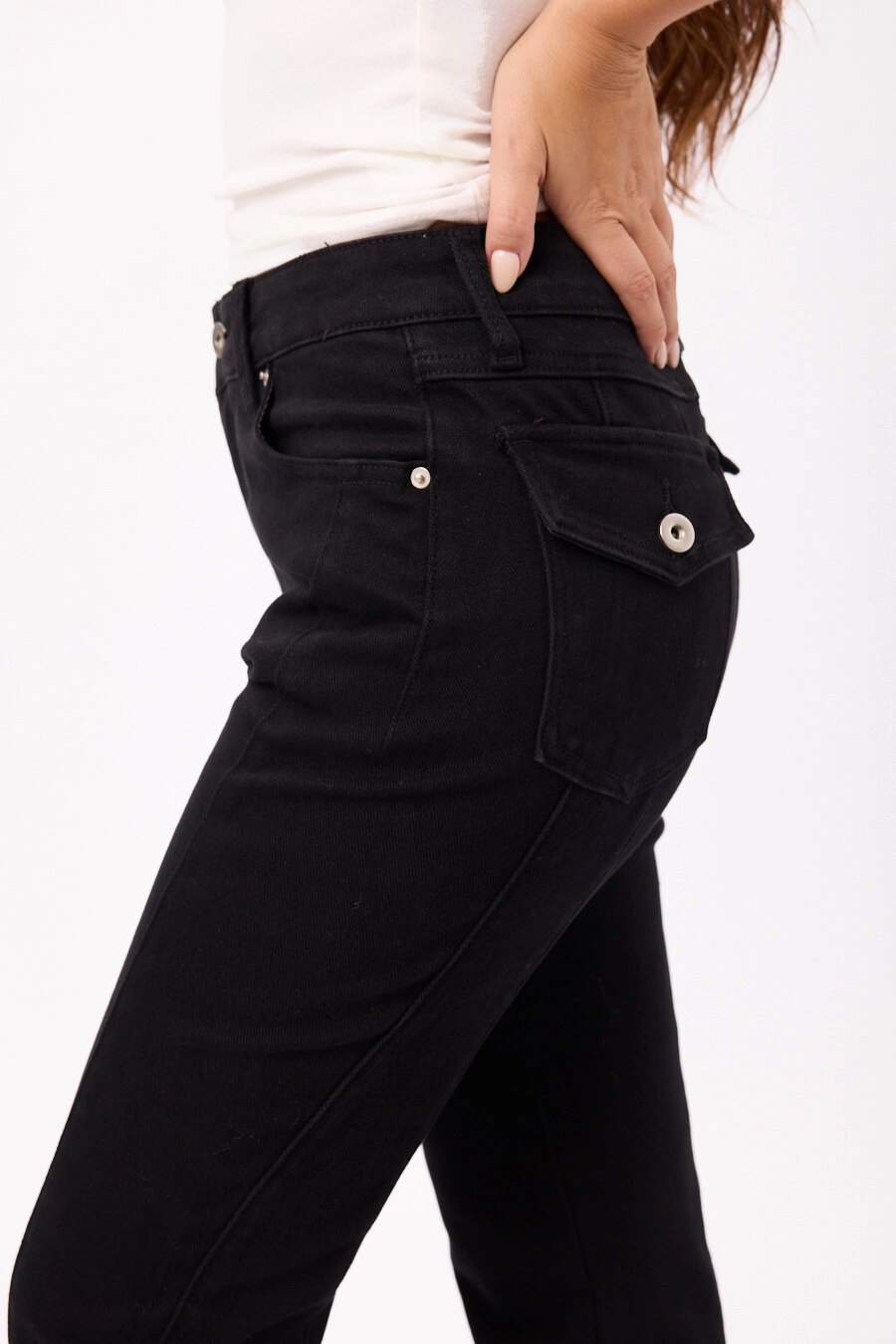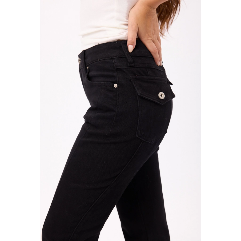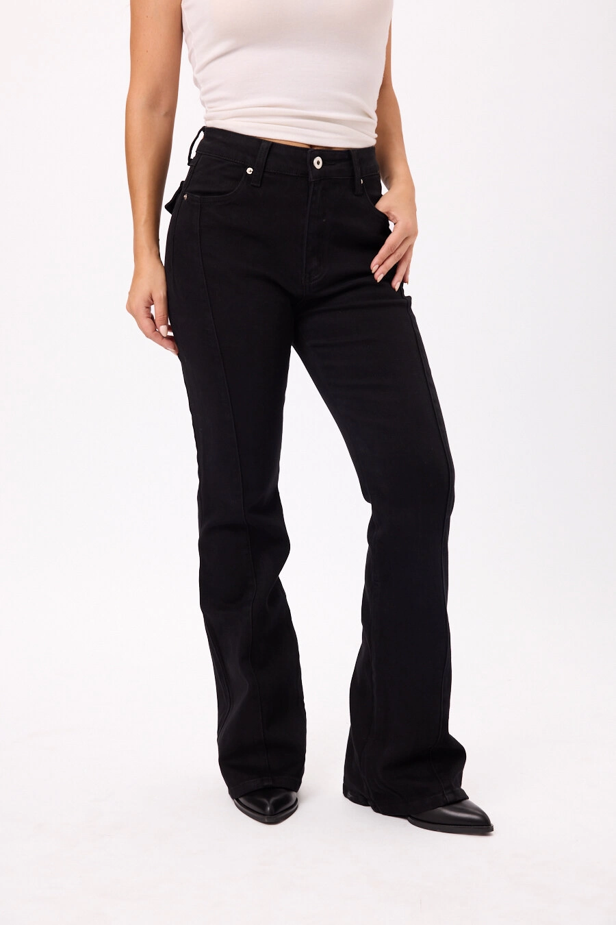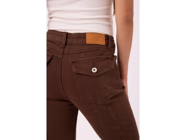 Pantalón tiro alto con pierna levemente acampanada Colores: negro y marrón. Talles S/M/L/XL.