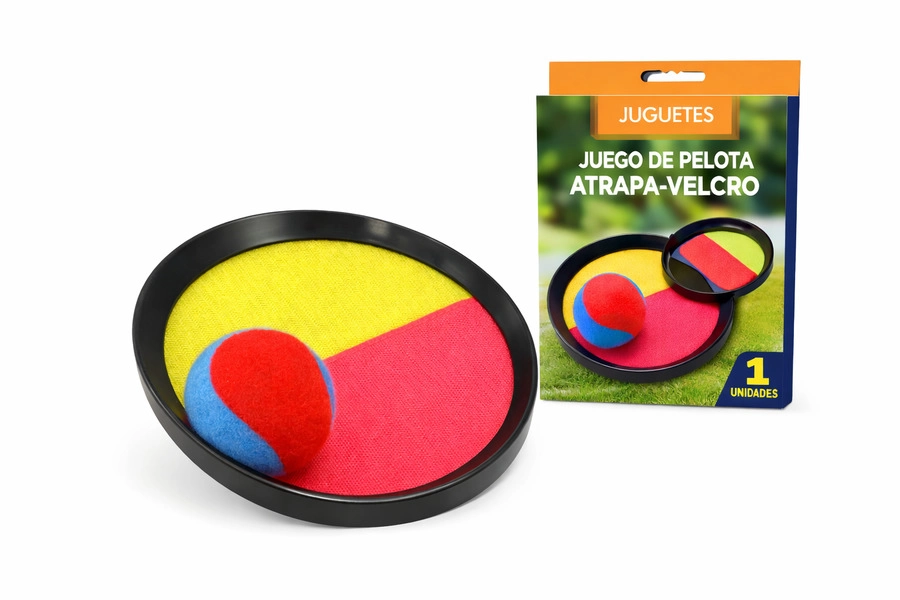 Juego de pelota atrapa-velcro ideal para diversión al aire libre. Incluye 1 unidad por paquete: paleta con superficie de velcro y pelota adherente. Liviano, resistente y fácil de usar, perfecto para niños y adultos.