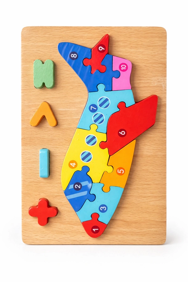 Puzzle de madera en forma de avión, ideal para niños. Incluye piezas encastrables de colores con números y formas que ayudan a desarrollar la motricidad fina, la coordinación y el aprendizaje temprano. Resistente, seguro y didáctico. Perfecto para jugar y aprender.