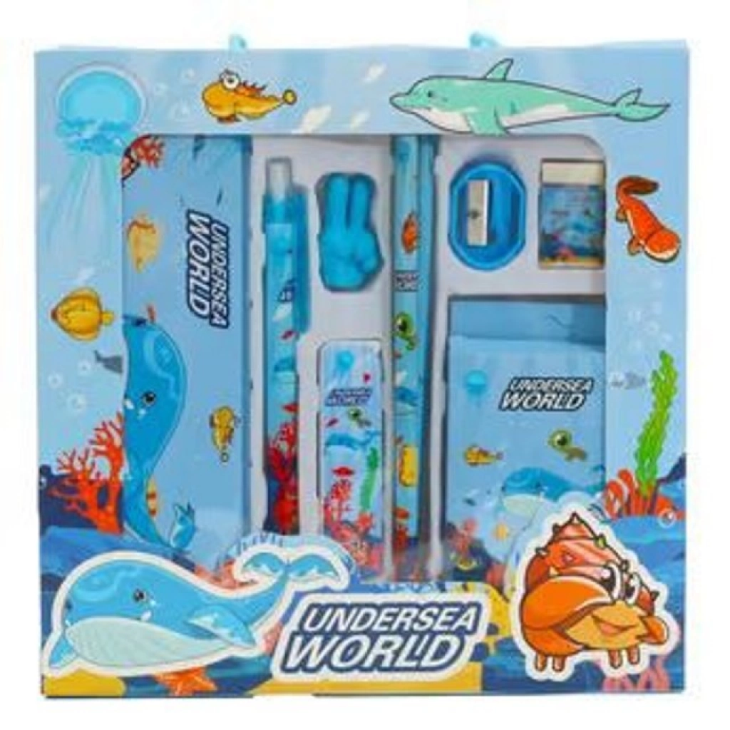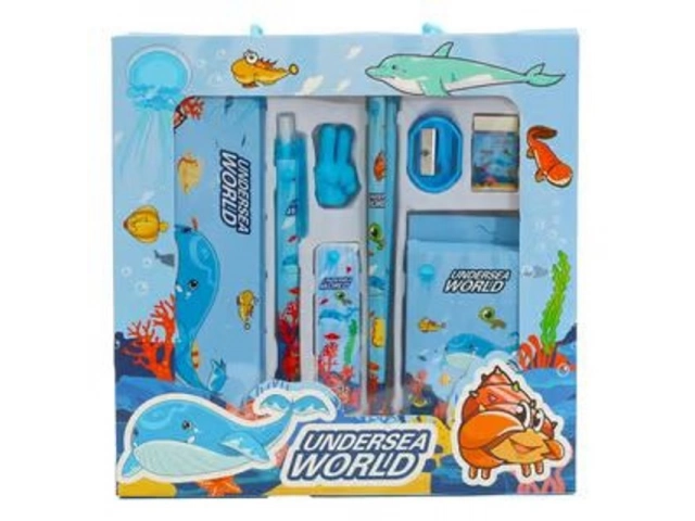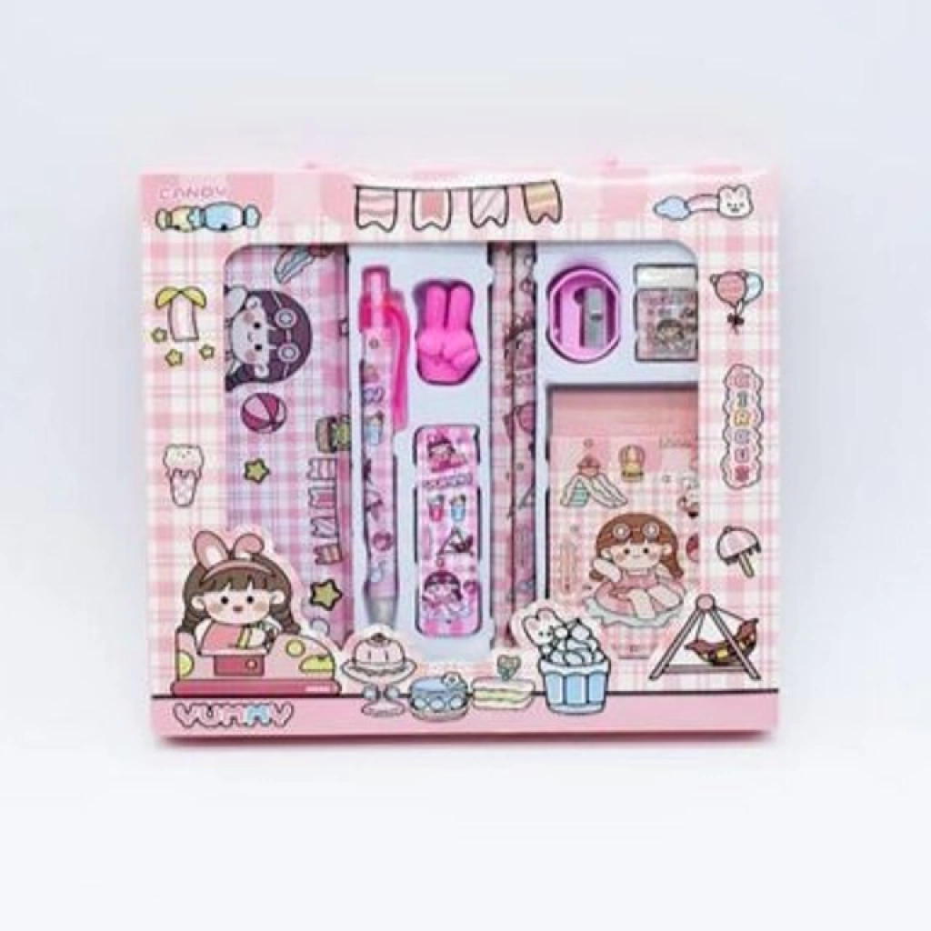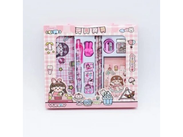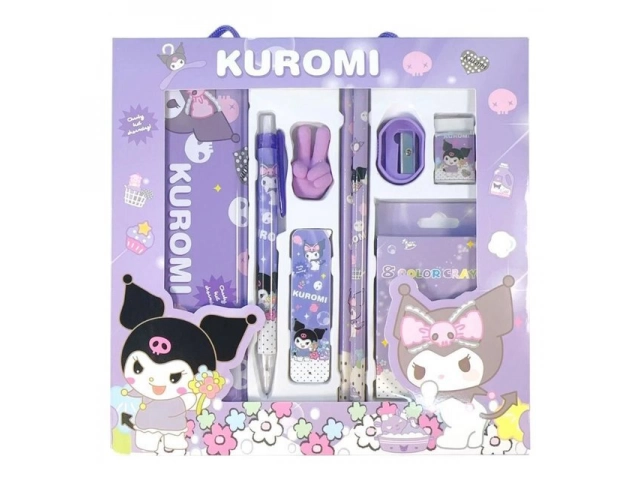 Set escolar con diseño Kuromi, Mar y Nena que incluye lápices, goma, sacapuntas, regla y más. Ideal para regalar o llevar a clase.