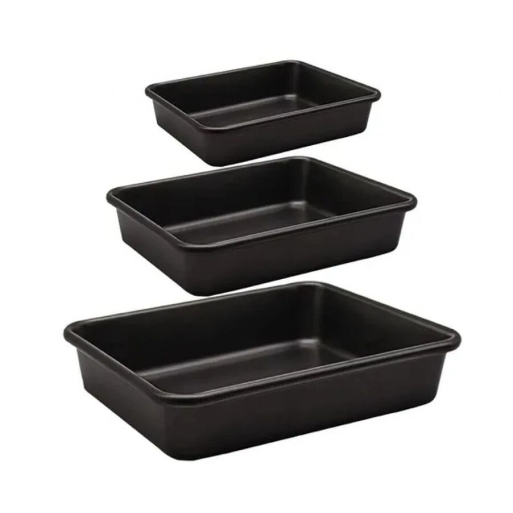 Set de bandejas rectangulares para horno en tres tamaños, resistentes y fáciles de limpiar. Ideales para cocinar en el hogar. Medidas: 32×22×5 cm / 37.5×25.5×5.5 cm / 42.5×28.5×5.5 cm.
